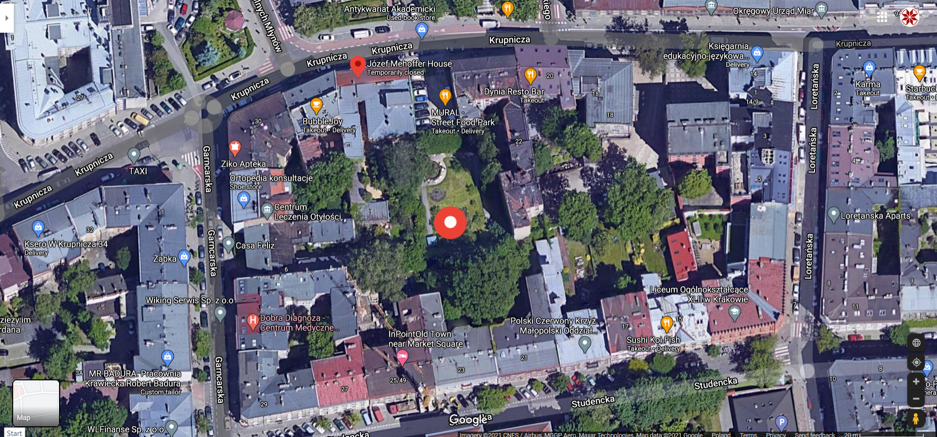 Ogród Mehoffera to jedno z tych magicznych miejsc w Krakowie, o których mało kto wie. Zamknięty rzędami kamienic, nie rzuca się w oczy. Nawet na Google Maps wygląda dość niepozornie...