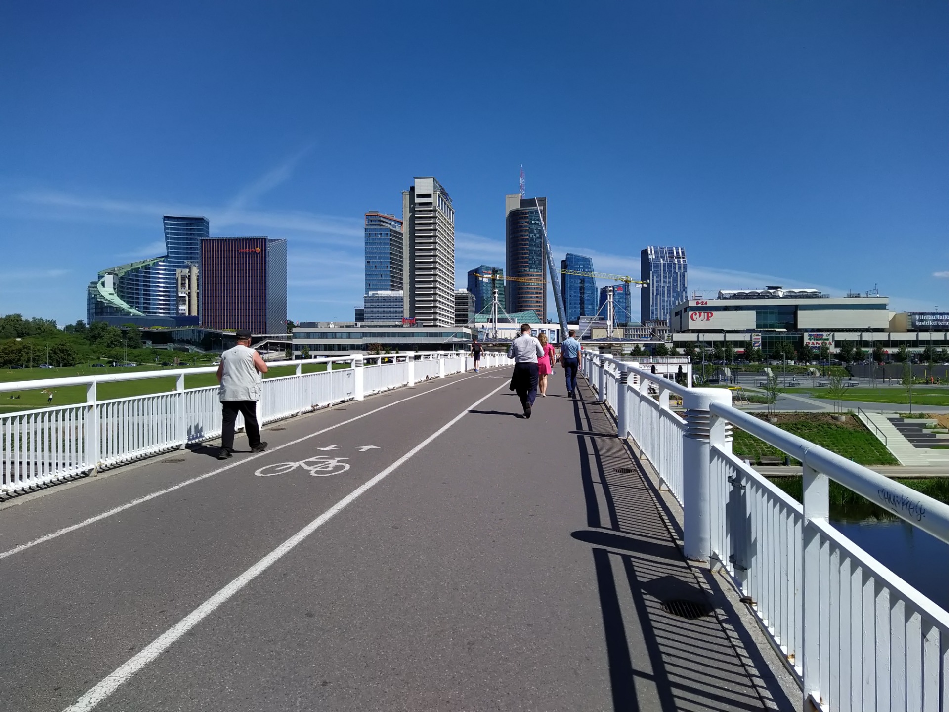 …i budującego się cały czas wileńskiego "city" w dawnej dzielnicy Rybaki. To jest część miasta, która zmienia się najszybciej. Jeszcze rok temu ta panorama wyglądała zupełnie inaczej. Nowoczesne budynki zaczęto tu budować jeszcze w czasach Związku Sowieckiego. Po drodze mija się ogólnodostępne boiska do koszykówki i całkiem spory skatepark. Tak więc wybierając się tutaj można zabrać piłkę albo skateboard.