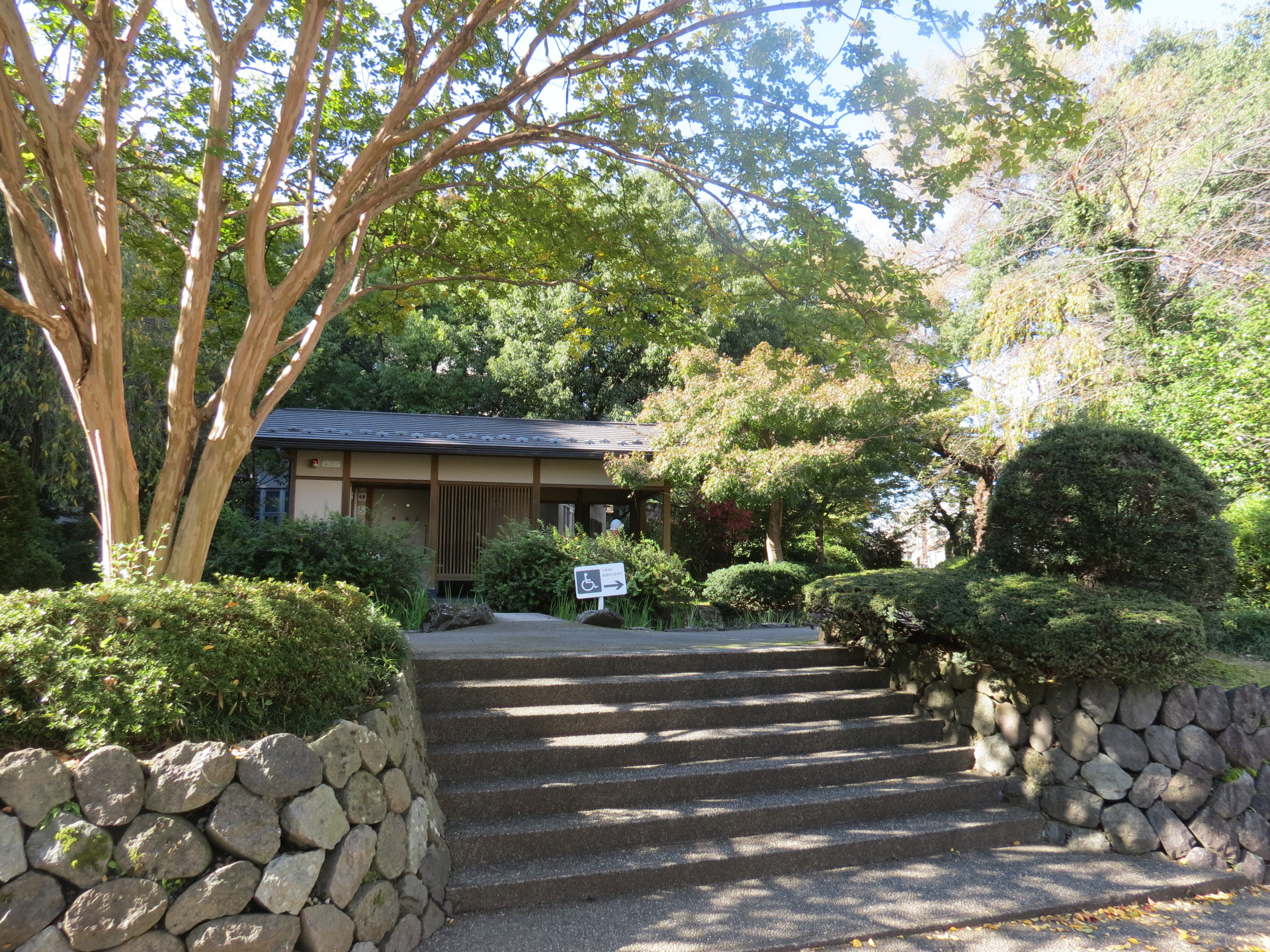 Tuż przy wejściu do parku znajduje się toaleta miejska. Ma bardzo przyjemny wygląd, jest zbudowana w tradycyjnym stylu. Nie byłam w środku, ale moją przychylność wzbudziło to, że takie miejsce może być zaprojektowane w ładny sposób, z drewnianymi elementami, w jasnych barwach