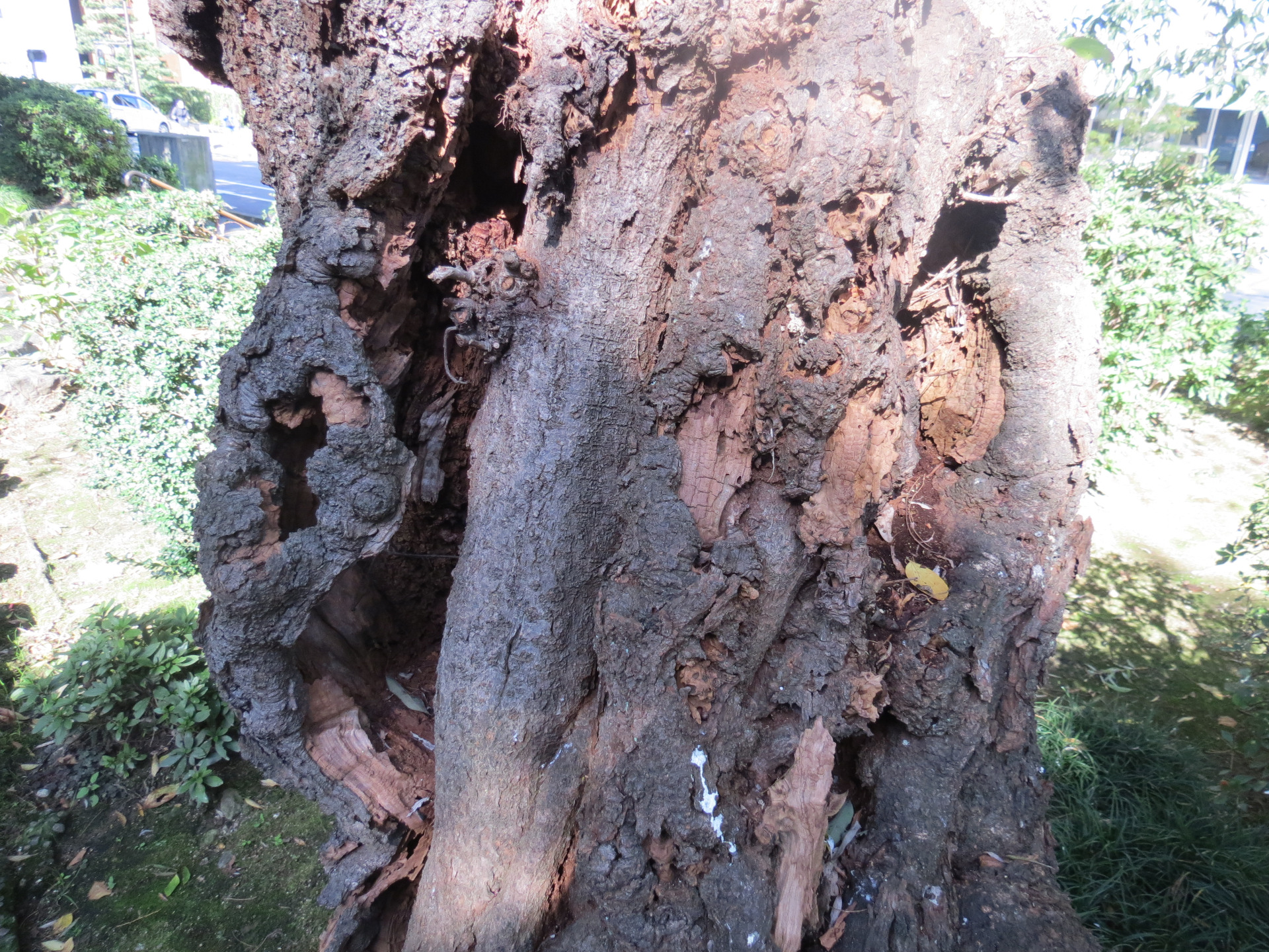Spodobał mi się ten pień, z ogromną dziurą w środku i mniejszymi w innych miejscach, tworzących ciekawe kształty. Cieszy mnie, gdy takie nieidealne drzewa nie są wycinane.