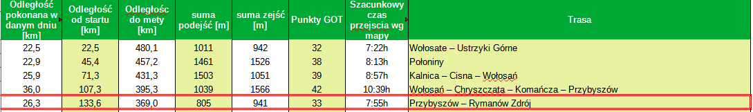 Siadamy na chwile na Bazie, która przy takiej pogodzie i końcówce sezonu świeci pustkami. W centralnej części bazy stoi znak informujący, że do Ustronia, czyli końca naszej przygody, zostało jeszcze 372 km (116:45h). Do Rymanowa Zdroju natomiast tylko 5,1 km (1,5h). Wykonuję telefon, aby upewnić się, czy dostaniemy jakieś miejsce noclegowe w Rymanowie. Miejsce się znajdzie, więc po chwili ruszamy dalej.