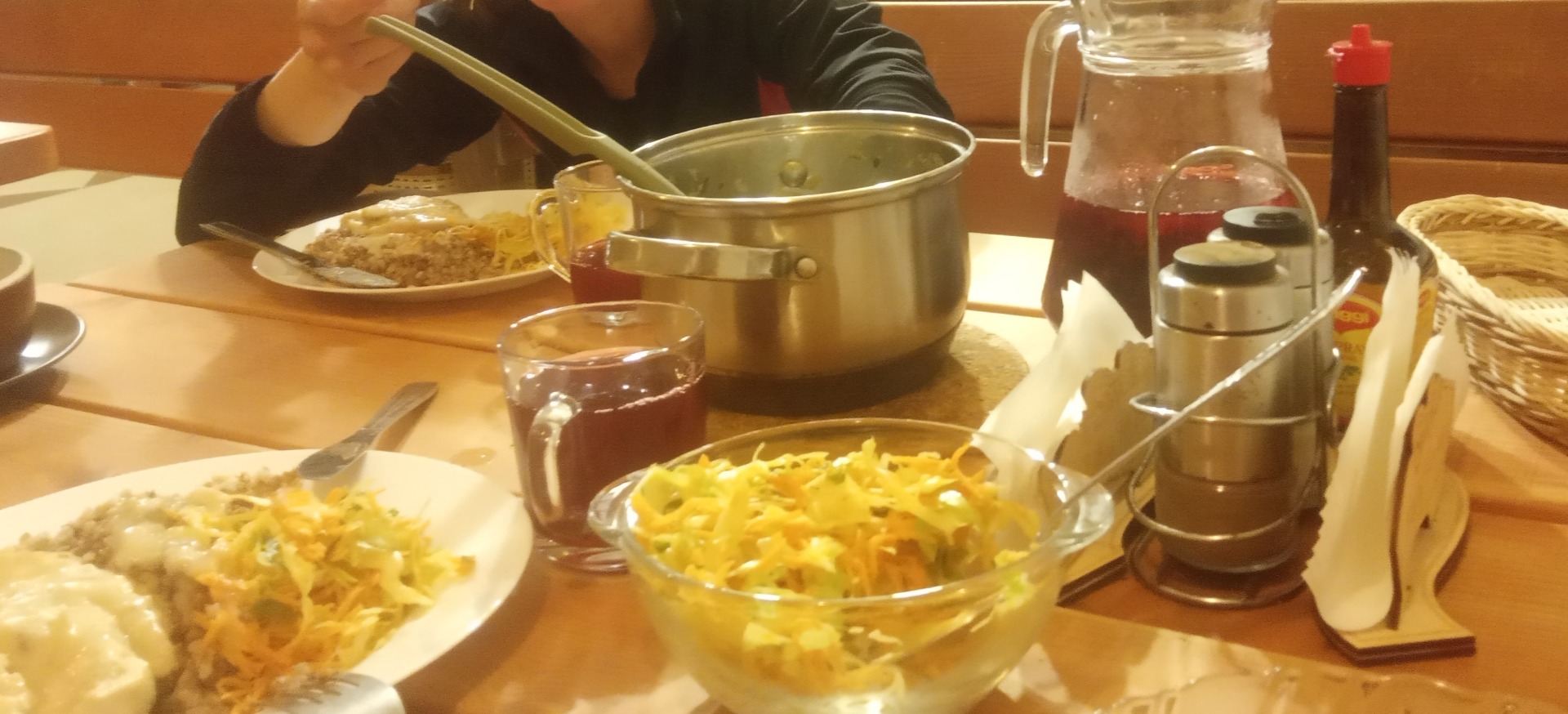 Właściciele zapraszają nas na przygotowaną kolację. Przed nami stoi duży gar zupy, a po chwili na stole lądują dwie porcje kasz z mięskiem, zestawem surówek i dużym dzbankiem kompotu. Gospodarz mówi, że miło byłoby, gdybyśmy wszystko zjedli, bo nie będzie musiał po nas dojadać. Patrzymy po sobie i z pewnością w głosie odpowiadamy, że raczej nie ma takiej możliwości. Porcja co najmniej na 3-4 osoby.
