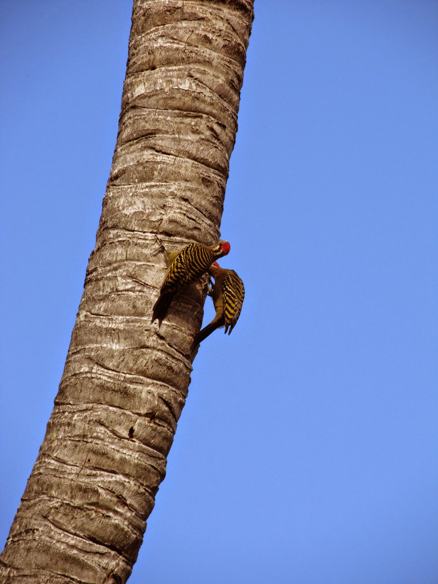 Z rana na palmie w pobliżu naszego tarasu widzimy jakąś tutejszą odmianę dzięciołów, bardziej obficie ubarwioną, niż ich kuzyni z Polski.
