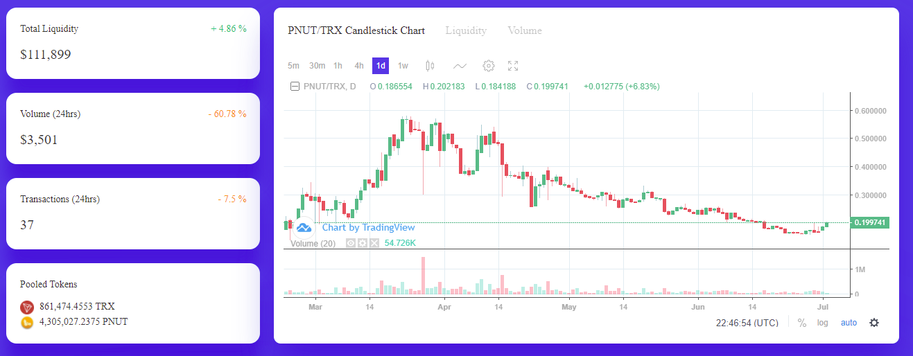 Peanut Delegationbigram13 (83)in #pnut • 5 years ago APY is slowly creeping up to 52.5% Price is currently 1.3 cents. Liquidity is increasing. More tron on the pool side #peanut #steem #tron