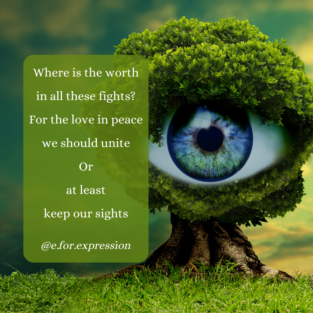 Keep Sightawesome1oo (33)in #poem • 4 years ago Where is the worth in all these fights? For the love in peace we should unite Or at least keep our sights. #poetry #fight #peace #love #unite #sight #see