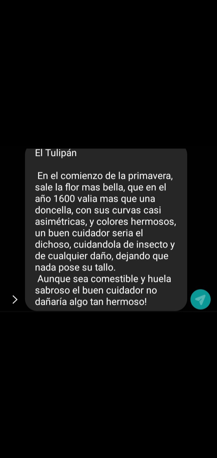 Tulipánchepovalera (27)in #poema • 4 years ago Este poema se lo escribí a una chica que me gustaba, era modelo, en un concurso donde cada chica representaba una flor y ella era el Tulipán 🌷 #spanish #love
