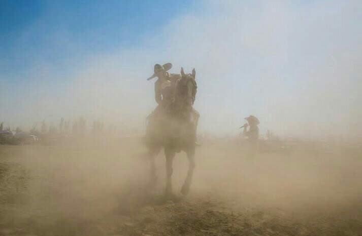 A horse rider comes to a stop as dust rises around him among the heat wave conditions. He is taking part in an event organized in the San Joaquin Valley which draws attention to water issues and conditions affecting people living in the area.