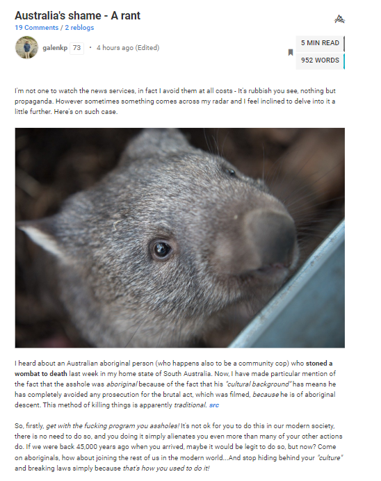 My absolute favourite rant of the week is by @galenkp. His passion for injustice comes across as he shares his quite justified outrage about the stoning of a wombat by a policeman, and the lack of justice for such cruelty. Tradition is one thing, using tradition as an excuse for being an asshole is quite another. What is your view on this issue? ### Read More....