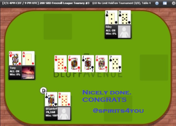 We had 40 players this week and a tournament run time of 2 hours 27 mins. We are glad to say the tournament was a success, with a new league player emerging as the winner. CONGRATULATIONS @spirits4you for taking down the final table swiftly, and mercilessly. Rounding out the top three was, 2nd place: @tbnfl4sun and @3rd place: @rileyechard