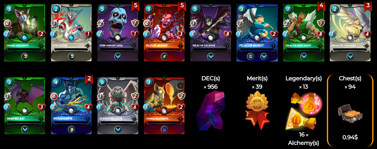 Splinterlands:- Sezonowe łowy to 94 skrzynie brązu dające wynik 956 DEC kilka kart. Do końca sezonu 14 dni i jeszcze nierozpoczęty. Każdy sezon to zmiana strategii.
