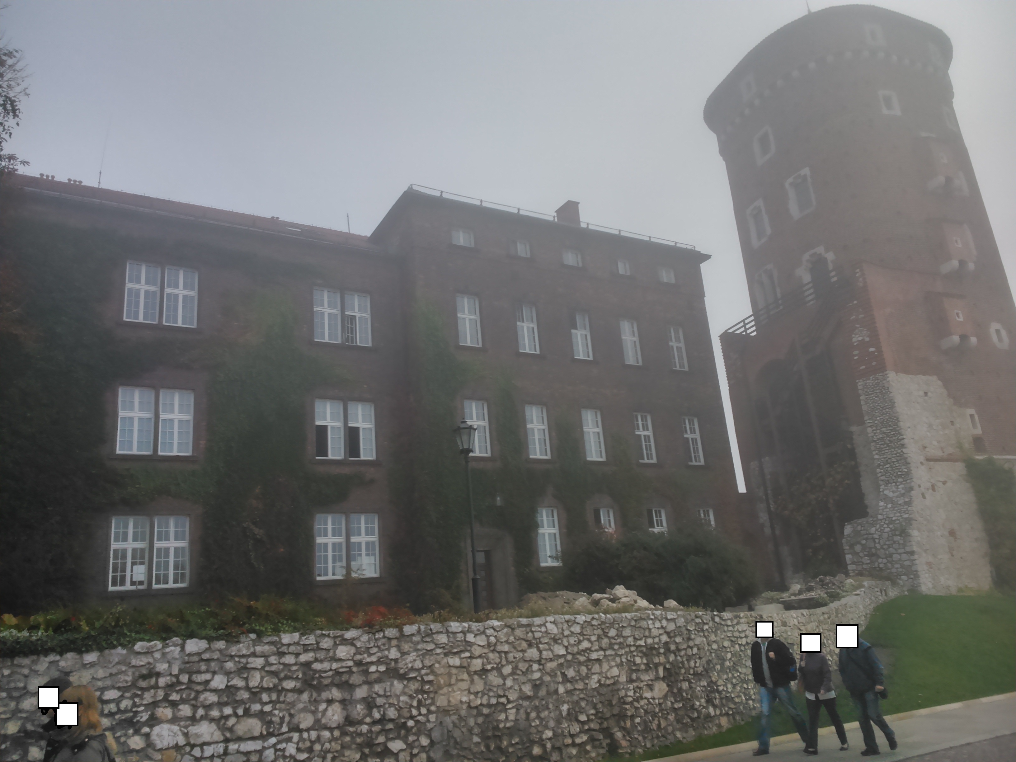 Przy posągu Smoka Wawelskiego byliśmy około godziny 8:45, po czym udaliśmy się w dalszą drogę, a mianowicie na zwiedzanie Zamku Królewskiego na Wzgórzu Wawelskim. Po drodze szliśmy częścią traktu królewskiego i mijaliśmy zamkowe baszty spowite we mgle. Idąc na Zamek Królewski na Wawelu, musięliśmy przejść tuż obok dwóch baszt (wież obronnych, gdyby ktoś nie wiedział). Najpierw minęliśmy Basztę Złodziejską, później Basztę Sandomierska, a z daleka (nie) było widać Basztę Senatorską. To był bardzo majestatyczny i niepokojący widok, ale udało mi się zrobić zdjęcie Baszty Sandomierskiej. Baszty Sandomierska i Senatorska to były tak zwane baszty ogniowe, czyli służące do ostrzału wojsk nadciągającego wroga. Obie baszty zostały wybudowane w celu wzmocnienia obrony południowej i południowo-wschodniej części Zamku przed najazdami.