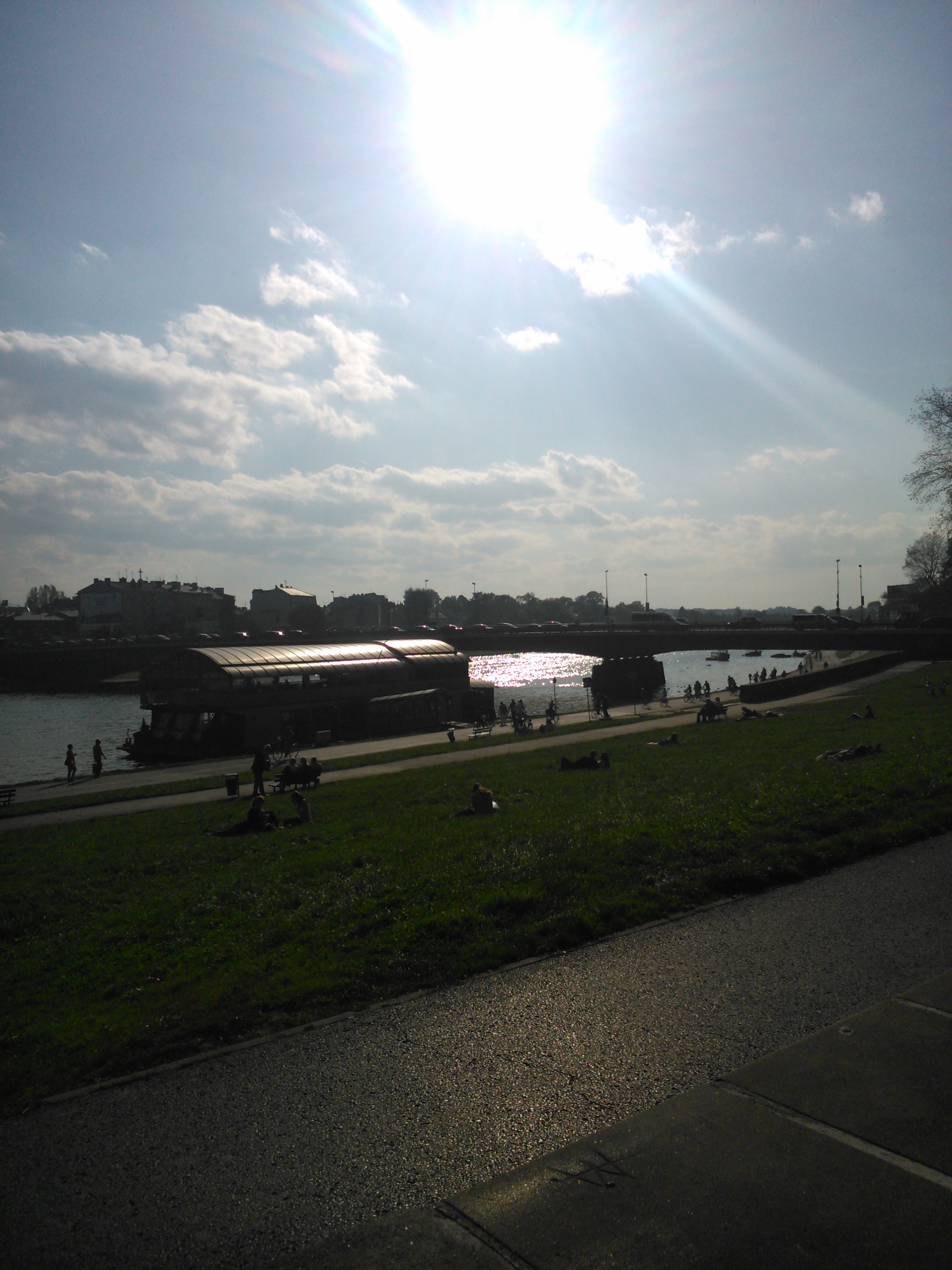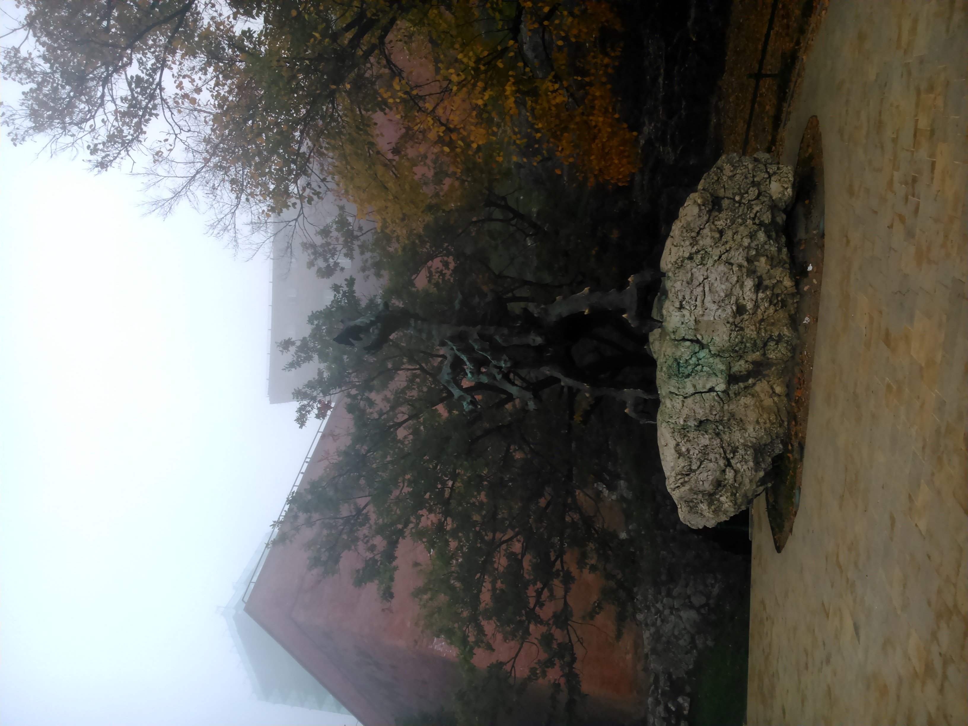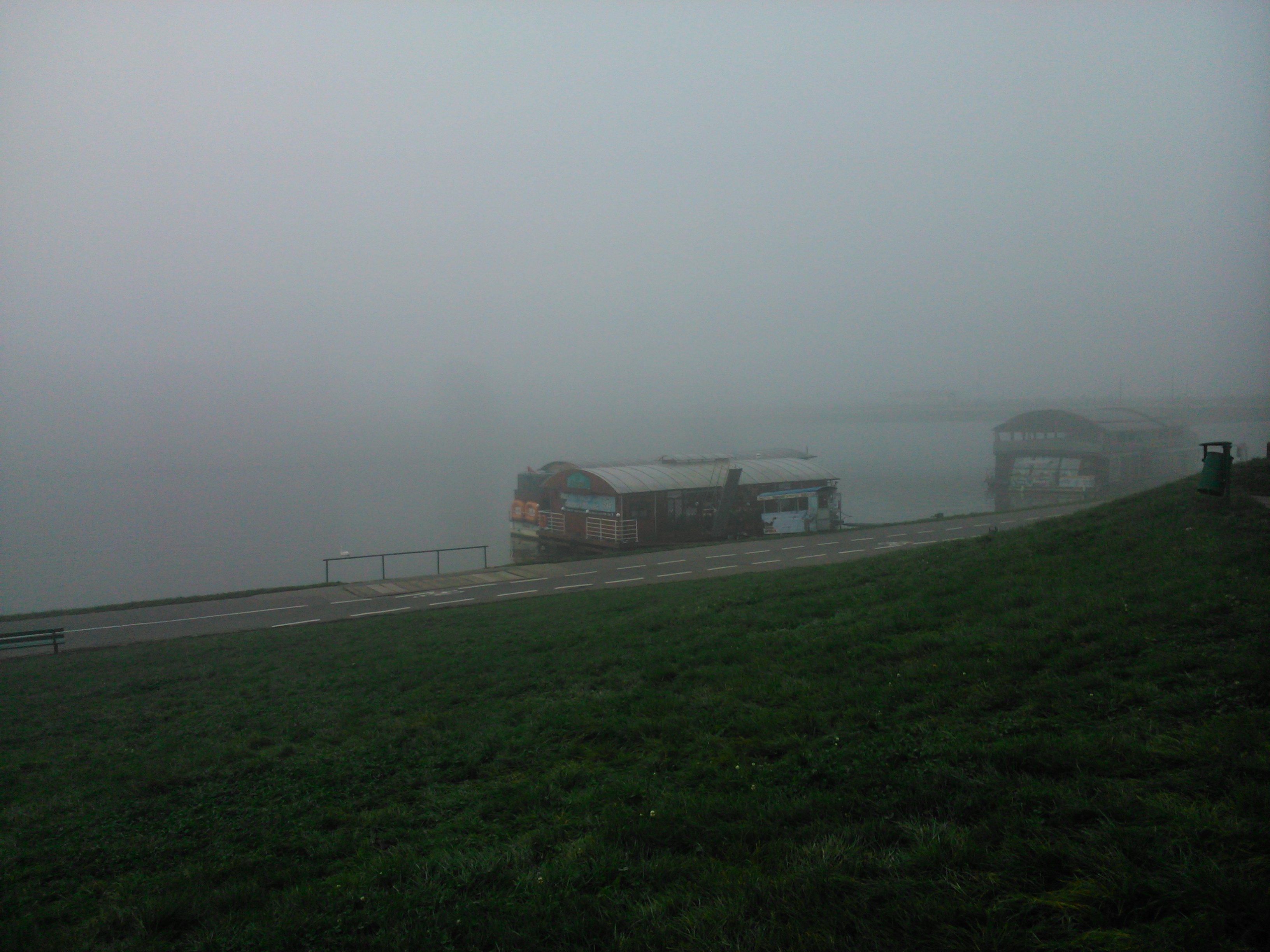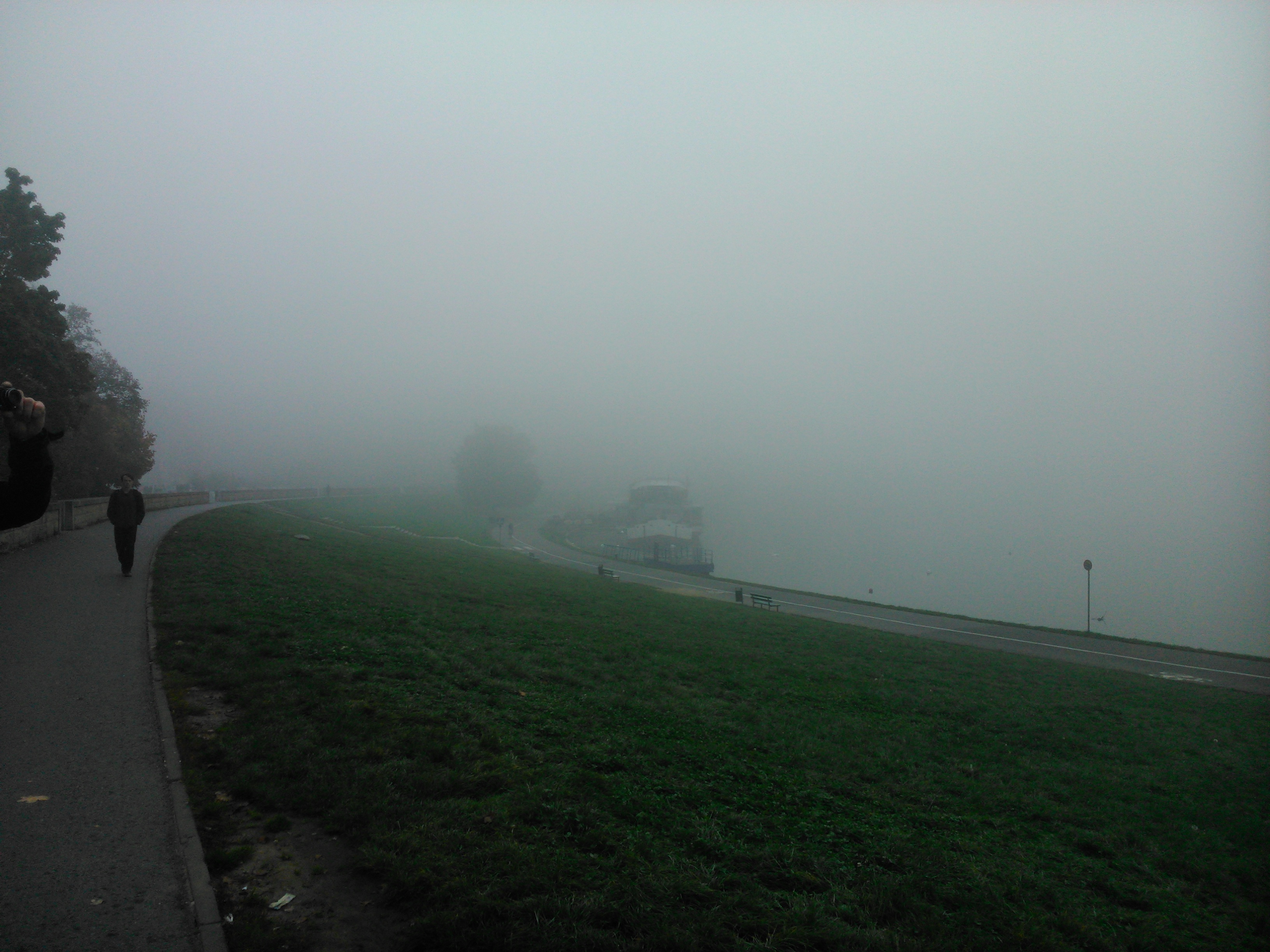 Do grodu Kraka przyjechaliśmy około godziny 8:00 i pamiętam, że była straszna mgła. Mniej więcej o godzinie 8:30 zajechaliśmy na parking znajdujący się tuż nad Wisłą obok Bulwaru Czerwińskiego, gdzie znajduje się Pomnik Żołnierzy Polski Walczącej autorstwa Bronisława Chromego, o którym napiszę pod koniec notki. Wtedy była taka mgła, że ledwie było widać Wisłę i tę przycumowaną barkę-restaurację (zapomniałem jak ona się nazywa). O pomniku Żołnierzy Polski Walczącej już nie wspominam, bo nie było go widać. Ale i tak wyjąłem swój pierwszy smartfon i zacząłem pstrykać zdjęcia Wisły spowite mgłą.