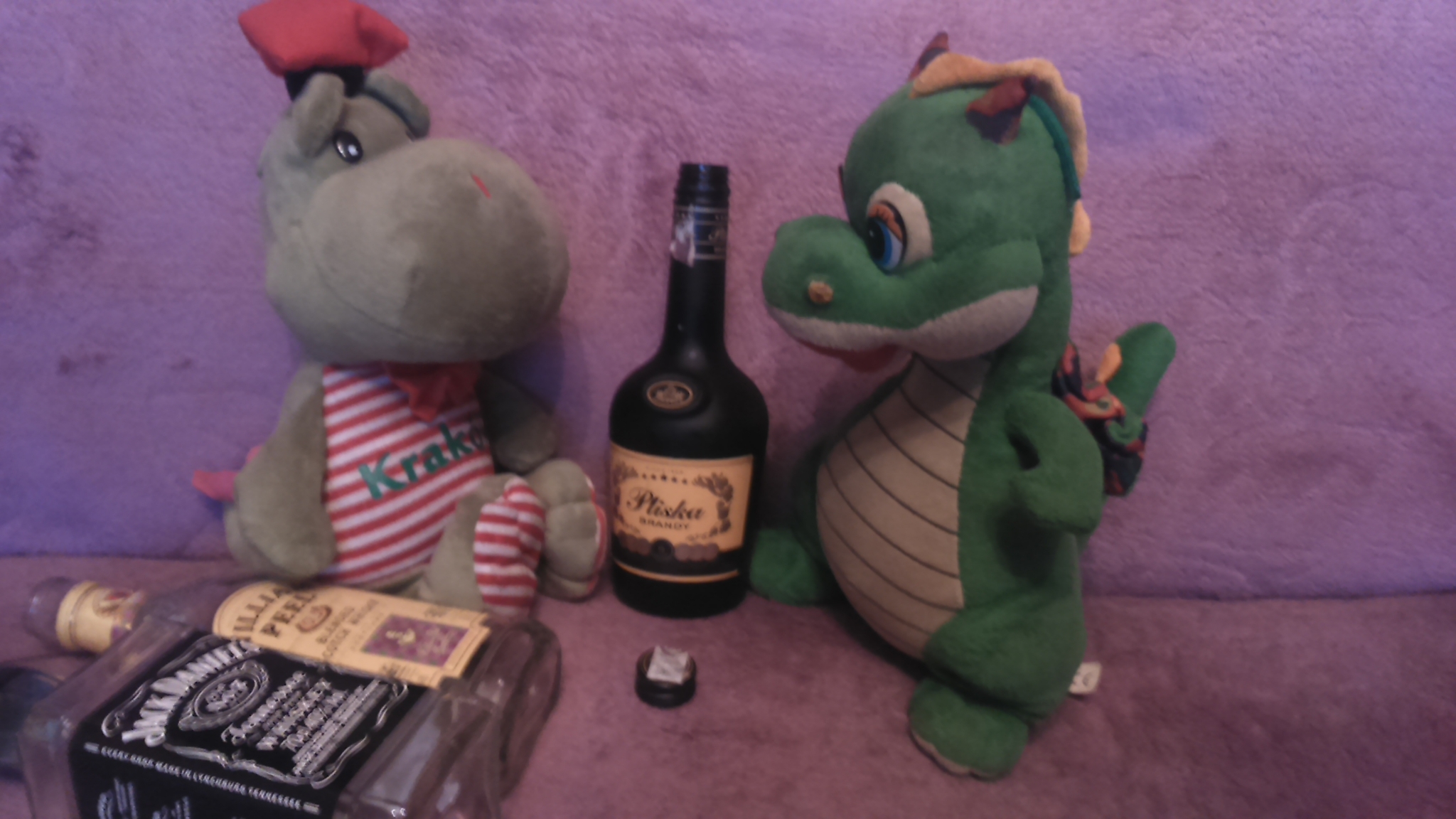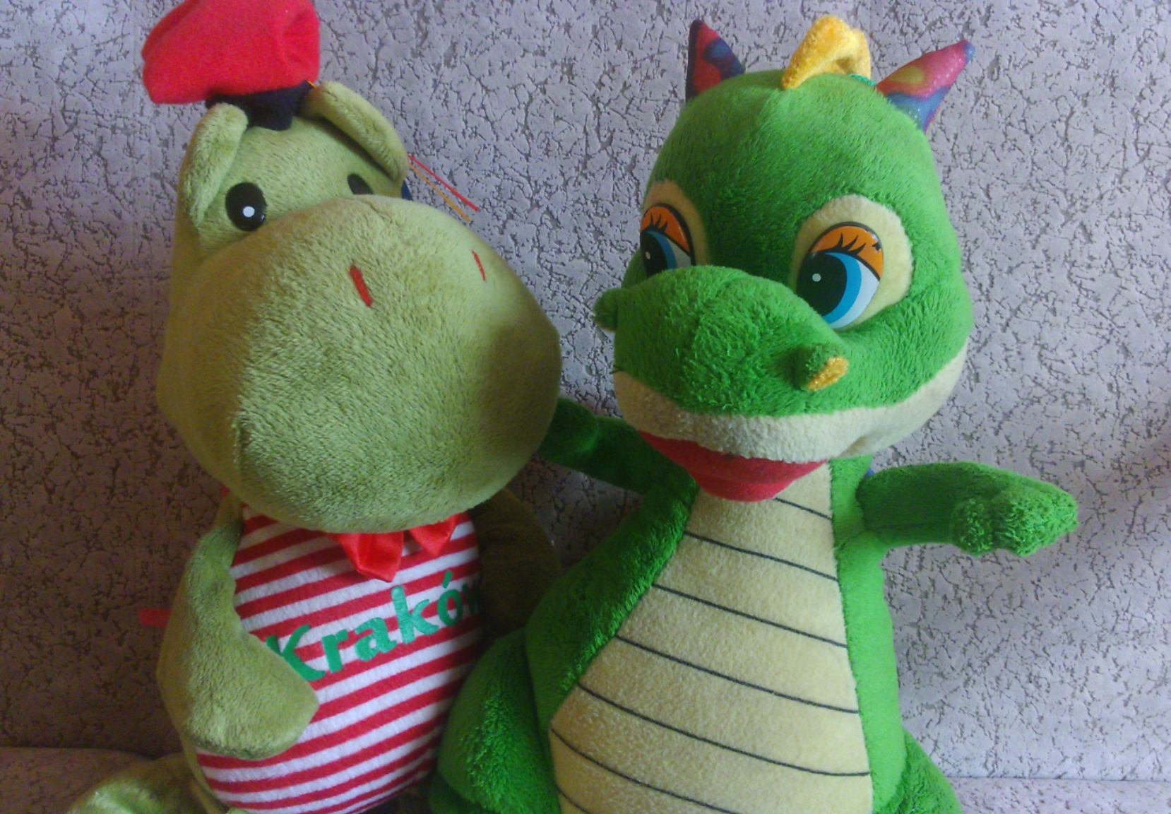 Po drugiej stronie tej ulicy prowadzącej na Zamek, gdzie stoi pomnik Smoka Wawelskiego, ustawione były stragany z pamiątkami. Jako że zostało mi około 70 złotych, to pomyślałem, że jeszcze sobie coś kupię. Widzę jeden stragan cały w maskotkach smoków, a jako dzieciak miałem bzika na punkcie pluszaków, zwłaszcza smoków, to postanowiłem sobie kupić jeszcze jednego. Patrzę, a tu wiszą takie 30 cm chucherka, jedno się na mnie patrzy tymi swoimi, pomalowanymi na niebiesko ślepiami. Słyszałem jak do mnie mówił : "Kup mnie". XD Patrzę, cena 54 złote, machnąłem ręką i kupiłem to zielone małe chucherko o śmiesznym, uśmiechniętym pyszczku.
