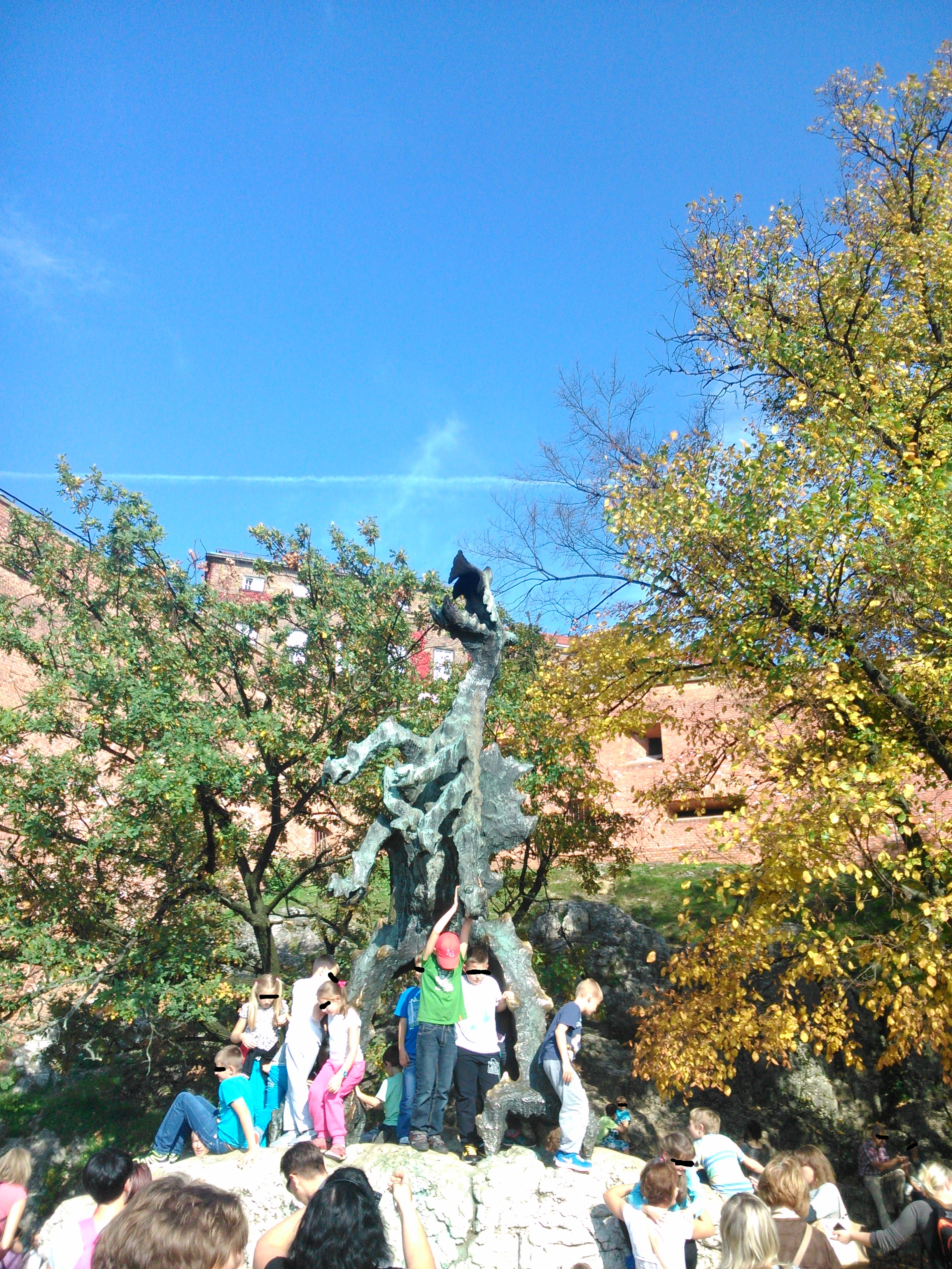 Wróciłem do tego Smoka Wawelskiego, patrzę, a tu dzieciarnia go oblega. Pomyślałem "no, trudno, przecież nie przegonię tego barachła" i zrobiłem parę zdjęć Smokowi Wawelskiemu molestowanemu przez dzieci. Akurat była piękna, letnia, słoneczna pogoda. Było około 25°C, ludzie chodzili w krótkich rękawkach (a ja w tym swoim t-shircie z plakatem "Szczęk" Stevena Spielberga), a niektórzy nawet się opalali na Błoniach, jakby to było lato.