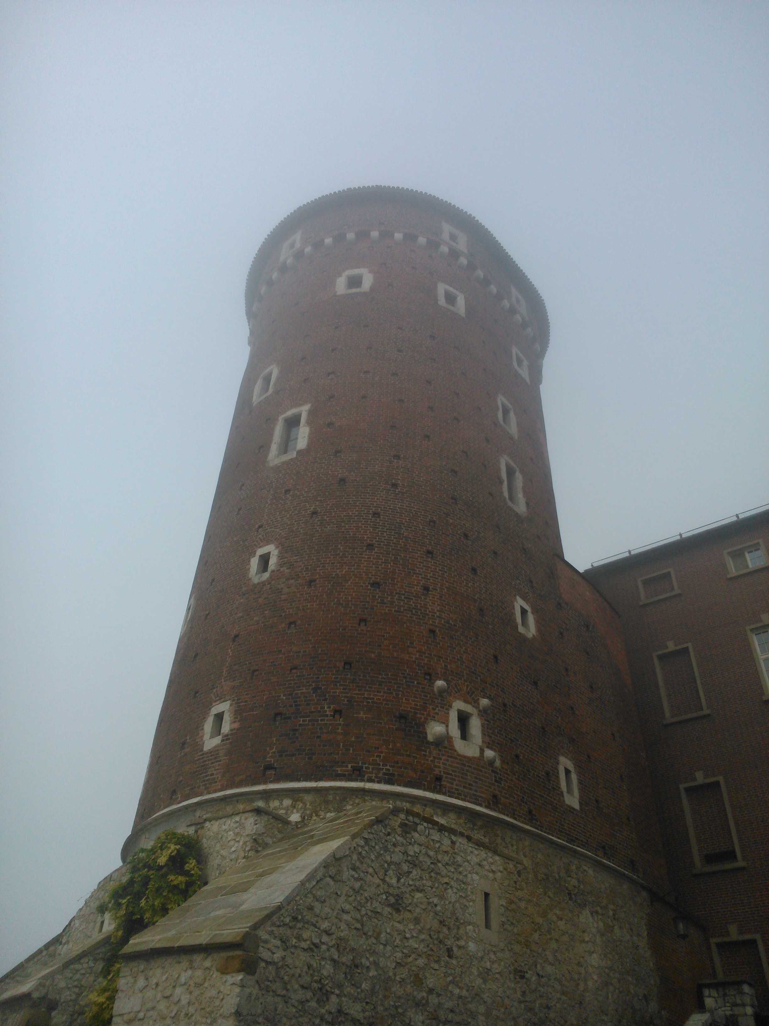 Drugą basztą, którą mijaliśmy, była Baszta Sandomierska. Jest jedną z trzech zachowanych baszt na Zamku Królewskim w Krakowie, a zarazem jedną z dwóch baszt ogniowych, czyli przystosowaną do otwarcia ognia w razie napaści na zamek. Drugą basztą ogniową była Baszta Senatorska. A w czasie pokoju Baszta Sandomierska służyła jako więzienie, ale dla osób "szlachetnie urodzonych", bo plebs taki jak ja, zostałby osadzony w lochach pod zamkiem. Baszta Sandomierska została wzniesiona w południowej części Zamku, w okolicach roku 1460 za panowania króla Kazimierza Jagiellończyka. Z tego co mi wiadomo, jest możliwość zwiedzenia tej baszty. W środku trzeba przebyć 137 stopni, by wejść na górę, ale podobno widok z niej jest niesamowity (ale nie we mgle).