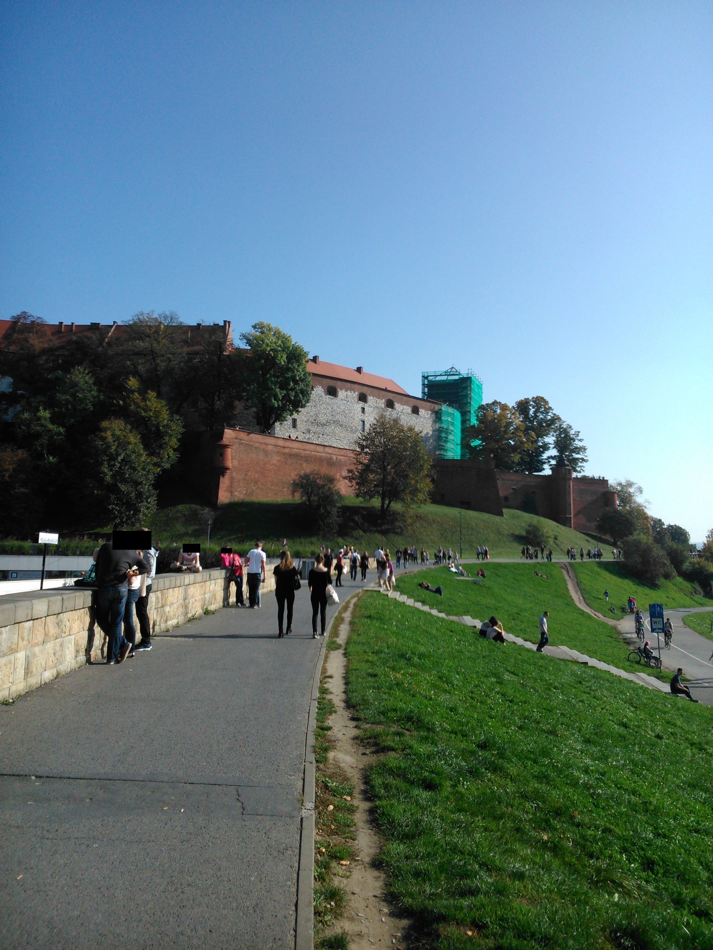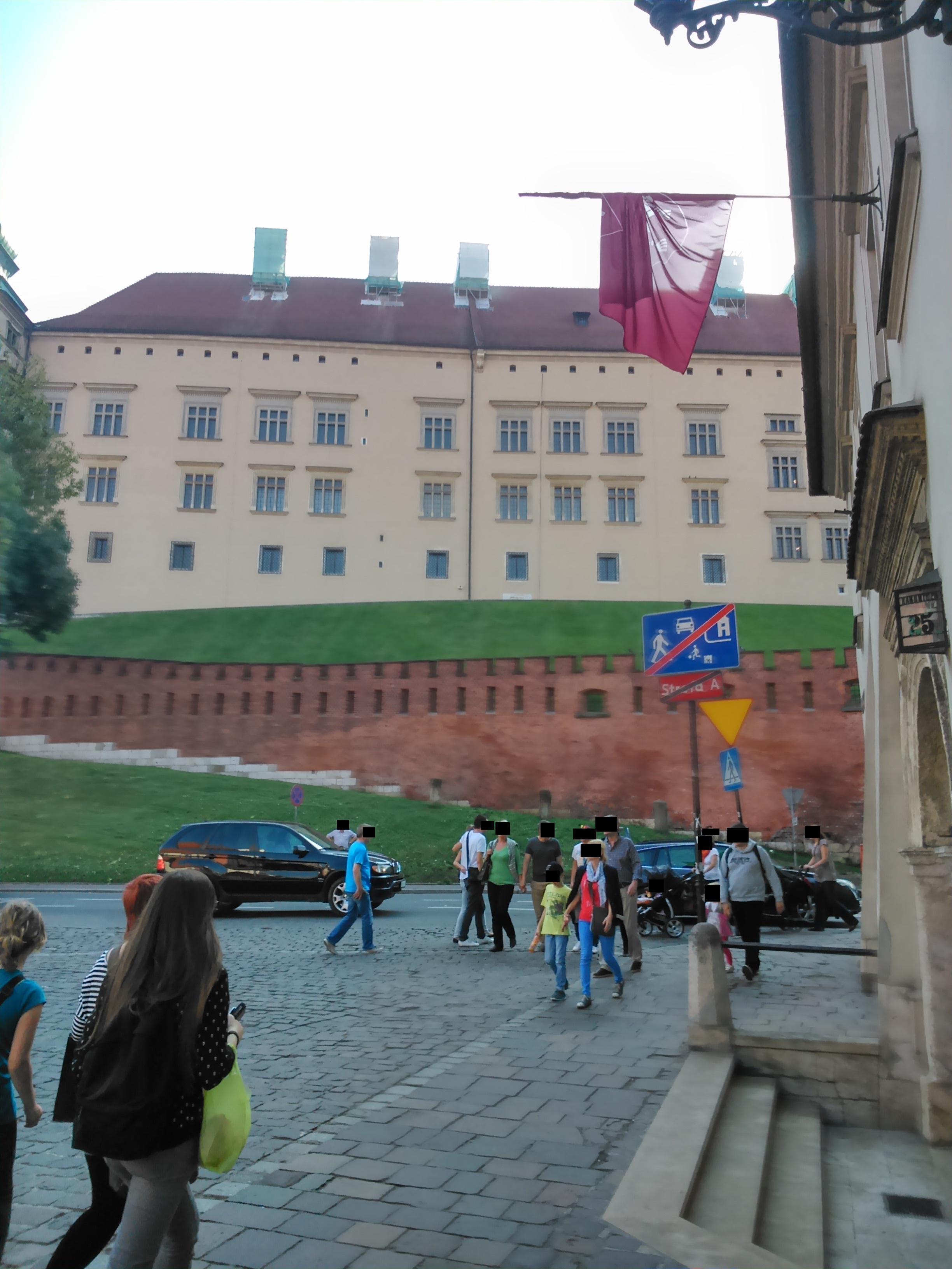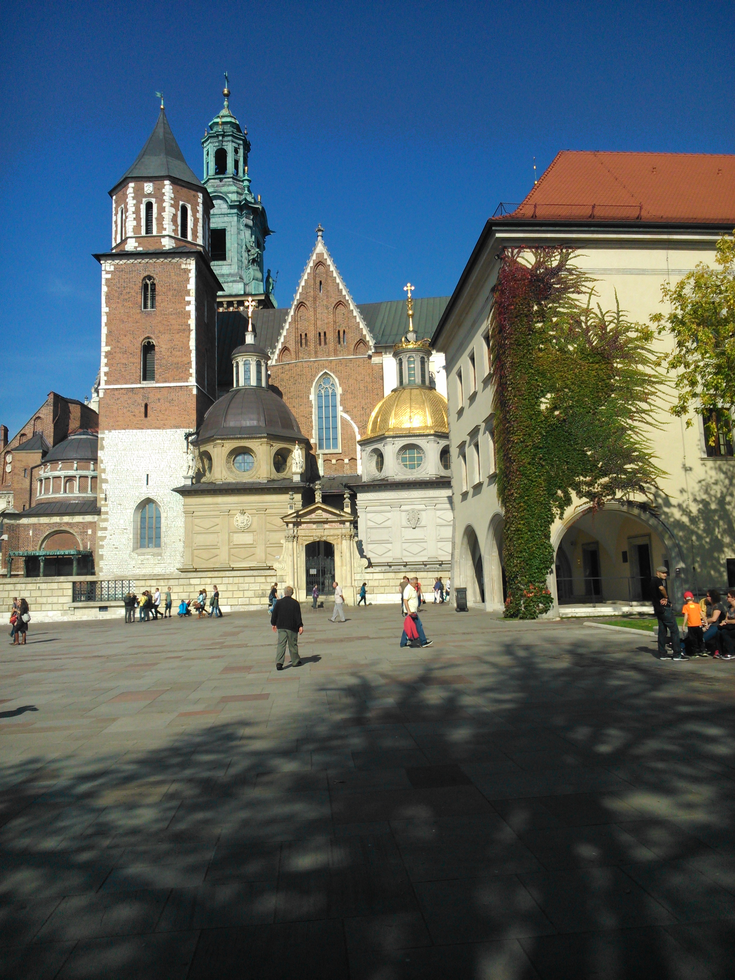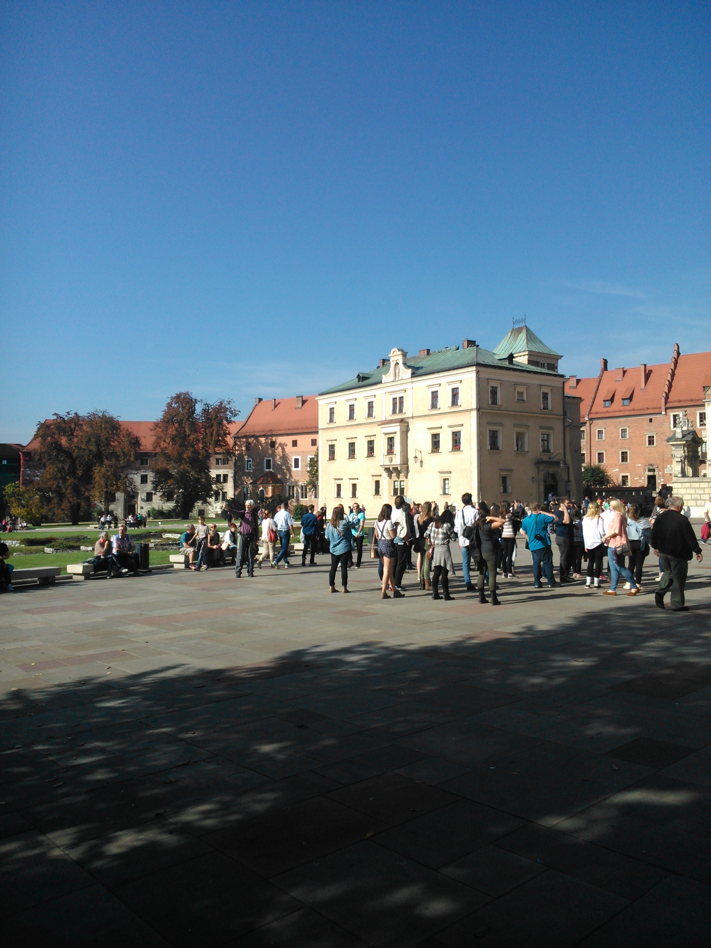 W tym czasie czekaliśmy na drugą grupę, bo się umówiliśmy. Jak się okazało, oni zakończyli zwiedzać Zamek godzinę po nas, a my jak te kołki czekaliśmy prawie do godziny 13:00. Część ludzi się zaczęła denerwować, bo nie wiedzieli czy tamta grupa zakończyła zwiedzać. Na szczęście jeden mądry, mój były majster, zadzwonił do kolegi z mojej hali i dowiedział się, że jeszcze zwiedzają. Część ludzi zeszła na dół do autokaru, a my czekaliśmy. W końcu wyszli z Zamku, mogło być około godziny 12:45 i zeszliśmy inną drogą, chyba obok Katedry na Wawelu. Pamiętam, że schodziliśmy po ogromnych schodach wzdłuż muru zamkowego.