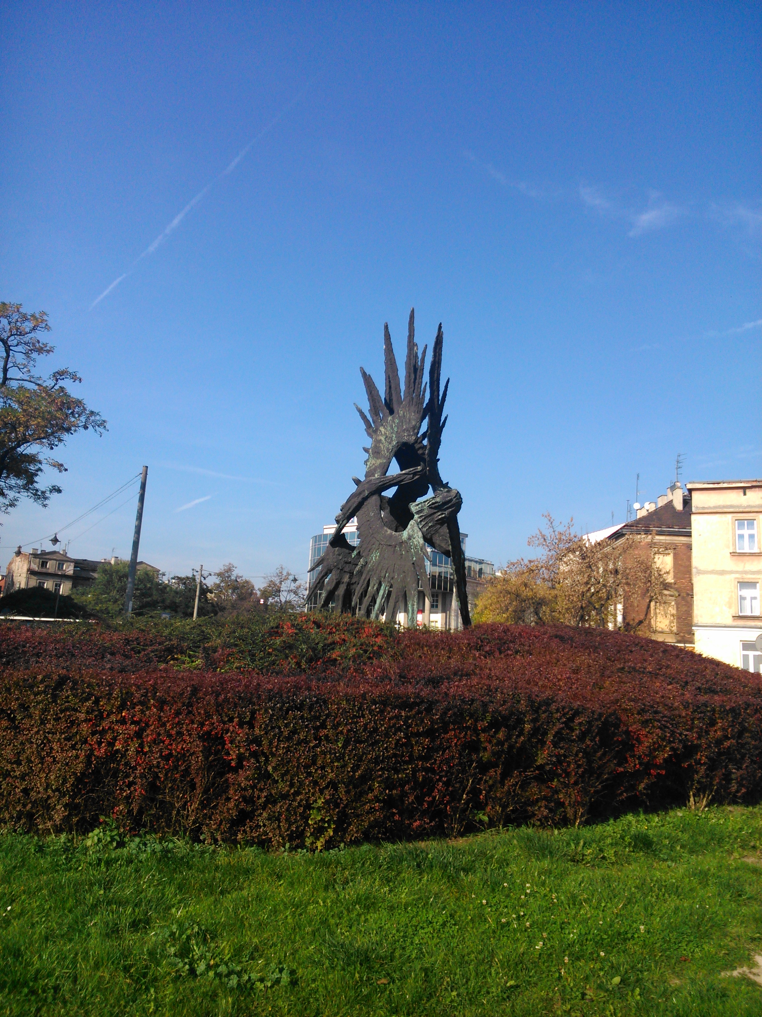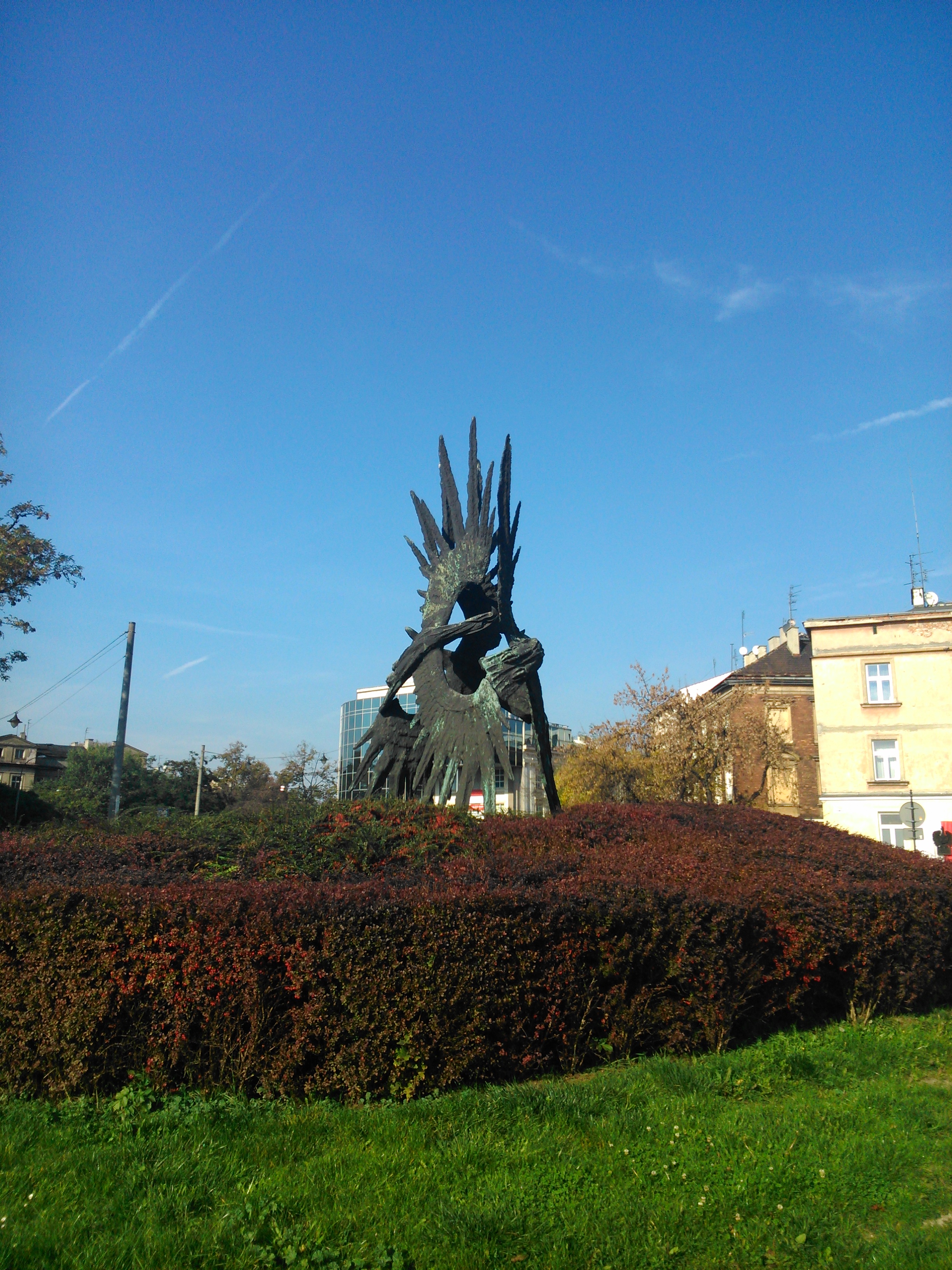 Bardzo zaintrygowała mnie ta rzeźba, która znajduje się nad Wisłą, niedaleko parkingu dla autokarów. Postanowiłem zrobić temu pomnikowi kilka zdjęć, zanim wsiedliśmy do autokaru o godzinie 15:00 i udaliśmy się do Pieskowej Skały na obiado-kolację. Później szukałem w internecie informacji o tym pomniku i czego się dowiedziałem. Jest to Pomnik Żołnierzy Polski Walczącej, który stoi niedaleko domu towarowego Jubilat na Bulwarze Czerwińskim, a dokładniej to jest na rogu ulic Powiśle i Zwierzynieckiej, tuż przy parkingu dla autokarów. Autorem tej rzeźby był słynny polski artysta, zmarły w październiku 2017 roku Bronisław Chromy, który był także autorem słynnego pomnika Smoka Wawelskiego stojącego nad Wisłą, u podnóża wzgórza wawelskiego, na którym stoi Zamek Królewski na Wawelu. Bronisław Chromy był rysownikiem, malarzem, rzeźbiarzem, a przede wszystkim profesorem Akademii Sztuk Pięknych w Krakowie. Pomnik Żołnierzy Polski Walczącej został odsłonięty 17 sierpnia 1992 roku, w 75 rocznicę powstania Związku Inwalidów Wojennych w Krakowie.