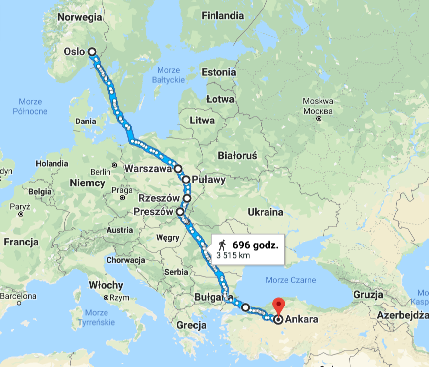Peter pokazał mi swoją pokonaną drogę na aplikacji mobilnej oraz wypytywał mnie jak wysokie mamy góry w okolicach Krosna, gdyż właśnie tą drogą planował się dostać na Słowację. Na podstawie tych informacji przybliżam wam mniej więcej zarys jego podróży.