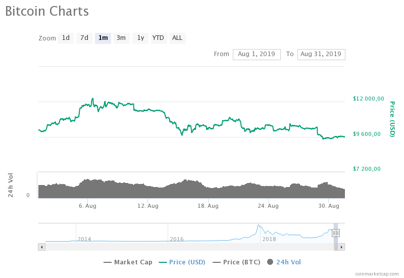 Bitcoin rozpoczął miesiąc na poziomie lekko ponad 10 000$. W ciągu kolejnych dni utrzymywał wycenę w przedziale 11 000 – 12 000$ aby ostatecznie osiągnąć 12 205$ dnia 6 sierpnia. W kolejnych tygodniach kurs bitcoina został uwięziony w konsolidacji 9600 – 11 000$. Końcówka miesiąca, jak wiemy, to już czterocyfrowa wartość króla kryptowalut, który miesiąc sierpień zamknął na wartości 9630,66$.
