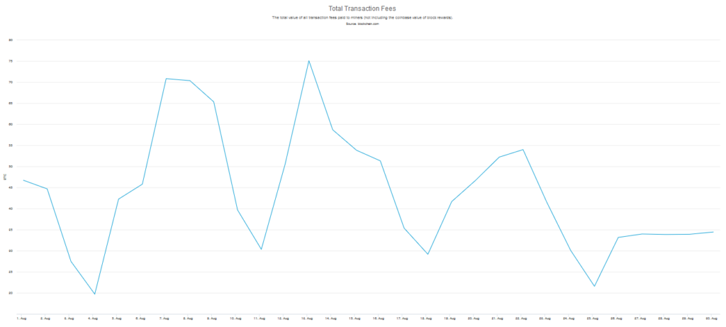 W sierpniu dzienna liczba transakcji BTC poruszała się z horyzontalnym zakresie między 270 a 370 tysięcy. W trzecim tygodniu miesiąca ten zakres zmniejszył się i zawierał między wartościami 288 a 340 tysięcy. Na koniec sierpnia odnotowaliśmy tendencję zwyżkową do blisko 350 tysięcy transakcji.