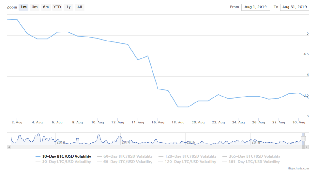 W przeciągu ostatnich 30 dni, zmienność kursu bitcoina sukcesywnie zmniejszała się z 5,37% na początku miesiąca do okolic 3,5%.