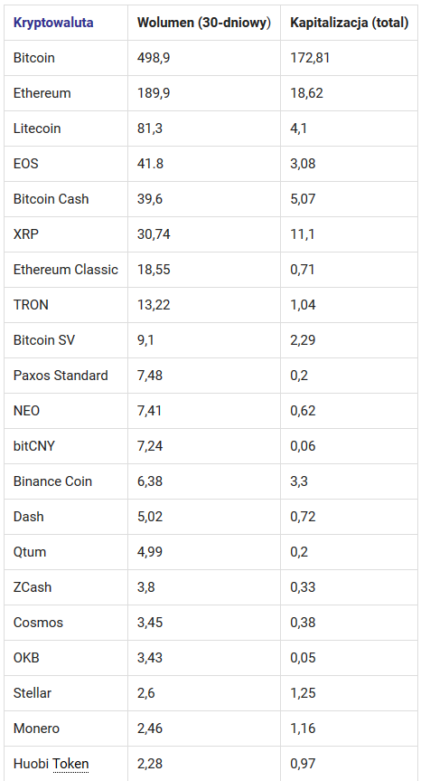 Zestawienie 30 kryptowalut o największym trzydziestodniowym wolumenie wraz z kapitalizacją na dzień 31 sierpnia 2019 (dane w miliardach $)