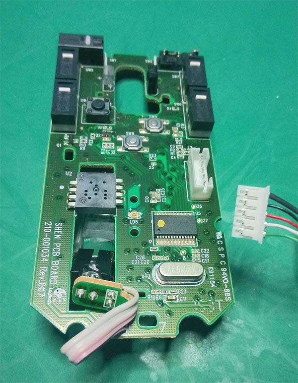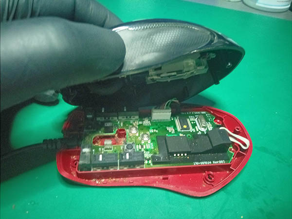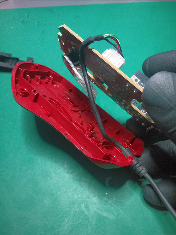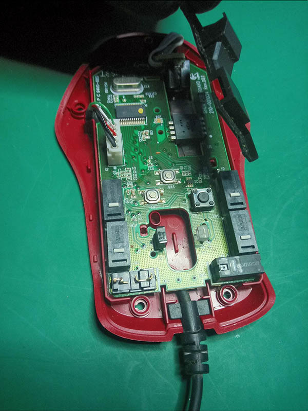 Teraz możemy wyciągnąć całą płytkę drukowaną z obudowy. W przypadku tej konkretnej myszy wyjąć należy też kabel, który puszczony jest pod płytką w specjalnym korytku i zabezpieczony przed luźnym lataniem specjalną gumową blokadą przy wyjściu z obudowy.