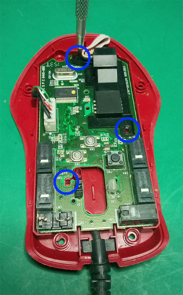 Teraz zabieramy się w końcu do naszego właściwego zadania. Na płytce dość łatwo zlokalizować jest mikro-przełączniki odpowiadające za działanie klawiszy. Namierzamy więc ten, który stwarza problemy. Najczęściej chodzi oczywiście o lewy przycisk. W tym momencie mamy dwie możliwości. Naprawiamy po kosztach, co wymaga cierpliwości i zręcznych palców, gdyż elementy mikro-przełącznika są, jak sama nazwa wskazuje, mikro. W tym przypadku nie będę się rozwodził jak zabrać się za naprawę takiego przełącznika, bo znalazłem w necie bardzo dobry poradnik jak tego dokonać i nie napisałbym tutaj nic ponadto co, jest tam opisane. Więc jeśli macie zręczne paluszki, czas i cierpliwość to odsyłam do tego poradnika.