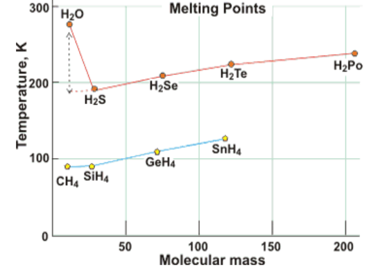 Temperatura topnienia/ wrzenia w wodorkach siarki/ selenu/ telluru wynosi kolejno -82°C/-60°C; -65,73°C/-41,25°C i -49°C/-2,2°C. Woda jako lekka molekuła (masa atomowa = 18) powinna potrzebować do osiągnięcia wrzenia znacznie mniej energii niż H2S (34), H2Se (81), H2Te (130). Zamiast tego, temperatura wrzenia wody jest ponad 150 K wyższa niż moglibyśmy przypuszczać podczas naszych teoretycznych rozważań. Tak samo temperatura topnienia jest ponad 100 K wyższa niż wynika z ekstrapolacji podczas porównania wody z innymi wodorkami grupy 6.