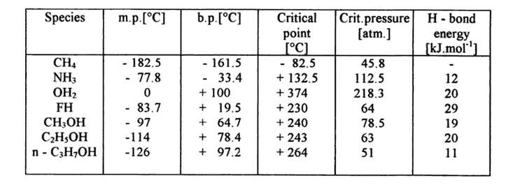Tab. 1 Temperatury wrzenia i topnienia oraz energie wiązania wodorowego dla kilku cieczy.