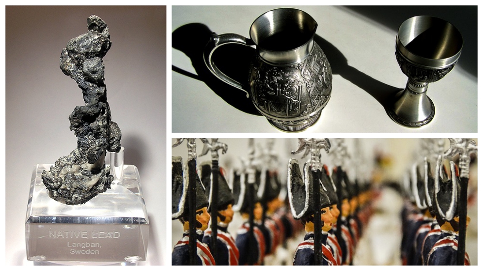 Rys. 3 Występujący naturalnie ołów; ołowiana czara oraz kielich; ołowiane żołnierzyki