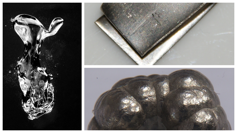 Rys. 4 Rtęć wyciekła ze zbitego termometru, zwróć uwagę na perfekcyjny owal kropel; rtęć metaliczna w ampułce; żarówka łukowa będąca składową mikroskopu do epifluorescencji