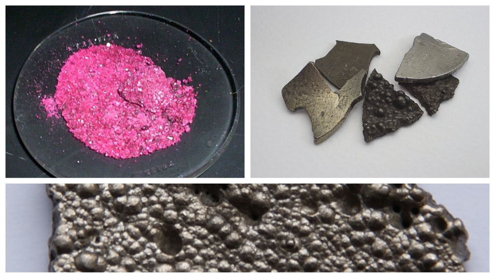 Rys. 2 Barwny heksahydrat chlorku kobaltu (CoCl2*6H2O); kawałki metalicznego kobaltu