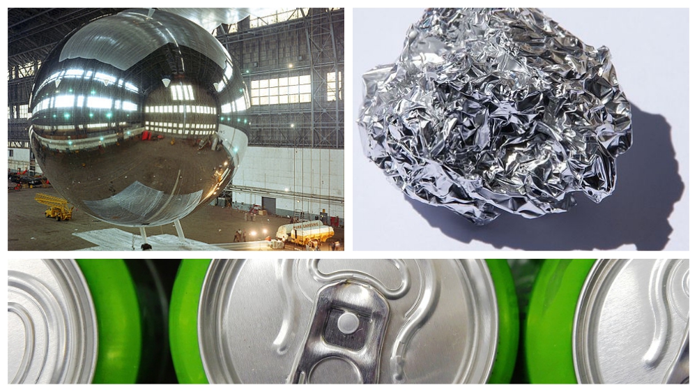 Rys. 5 Pokryty folią aluminiową balon satelitarny typu Echo o średnicy 30 m, odbijający sygnały radiowe w celu badania atmosfery; folia aluminiowa; barwione puszki wykonane z aluminium
