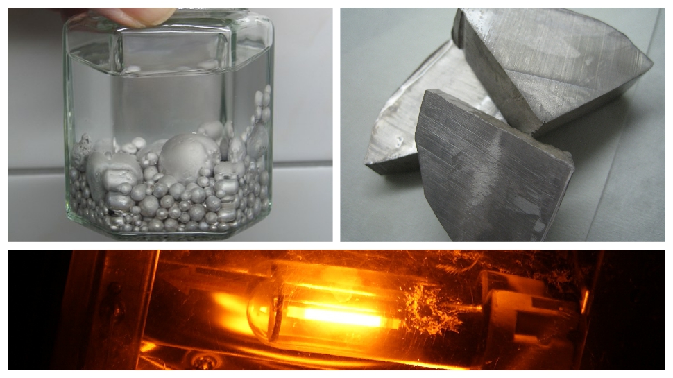 Rys. 1 Krople roztopionego i zastygłego ponownie sodu, kawałki sodu , specyficzna żółta barwa par sodu umieszczonych w lampie