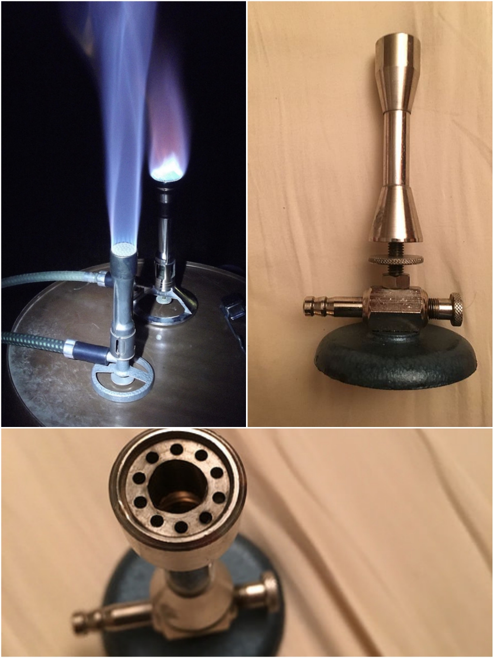 7. Palnik laboraoryjny ang. burner zasilany gazem z sieci - świetlnym lub ziemnym. Istnieją też palniki na tzw. gaz płynny z butli. Regulując dopływ powietrza można otrzymać płomień świecący i kopcący, albo płomień nieświecący z charakterystycznym stożkiem. Wyróżnia się więc w nim dwie strefy: redukującą i utleniającą. Na różnych wysokościach płomień ma bardzo różną temperaturę (zimny u nasady stożka, bardzo gorący tuż nad stożkiem). Jest to bardzo przydatne gdyż w palnik w laboratorium służy nie tylko do ogrzewania, ale także do przeprowadzania analizy "w płomieniu".