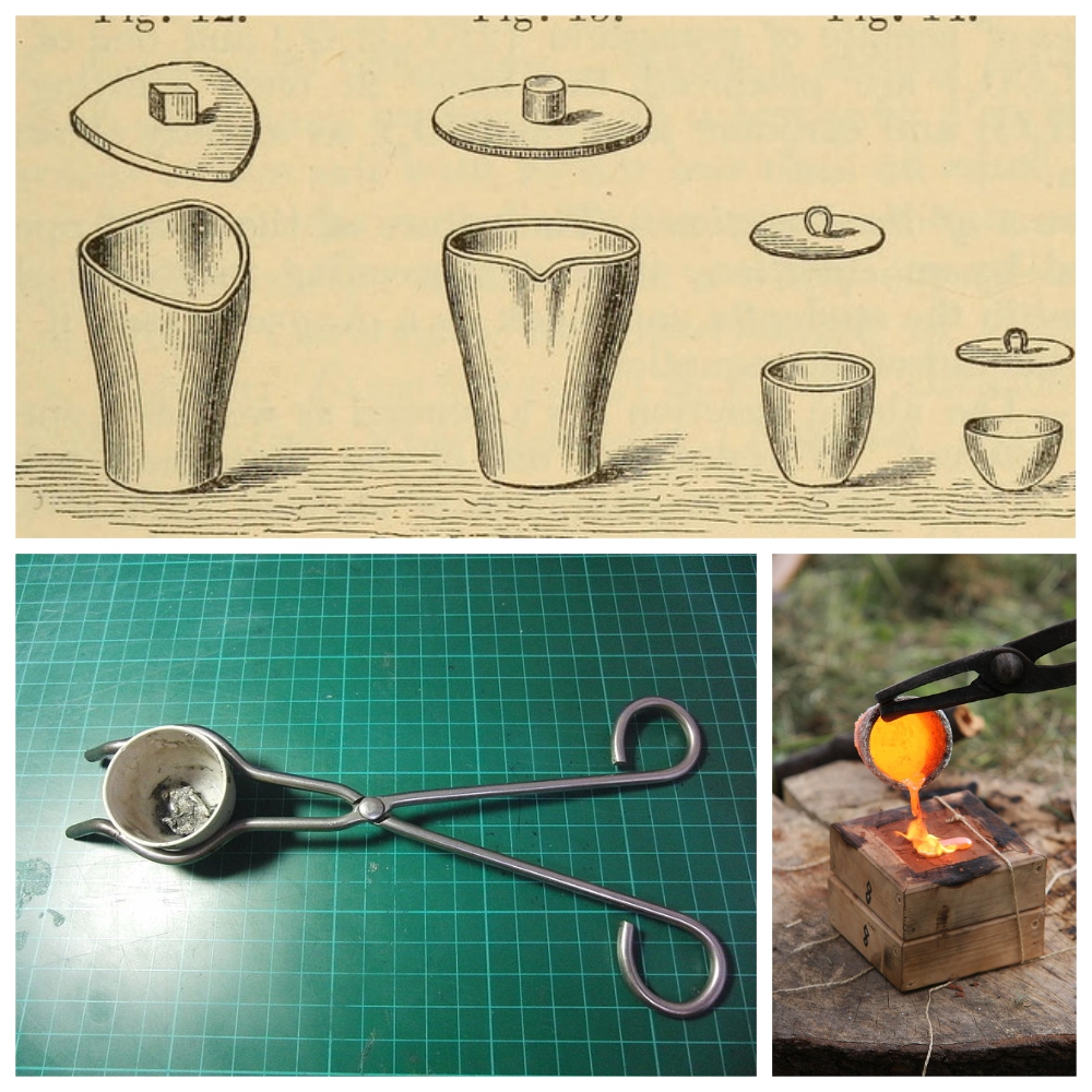 Rys. 1 Różne odmiany tygli z pokrywką; tygiel odlewniczy; tygiel trzymany szczypcami