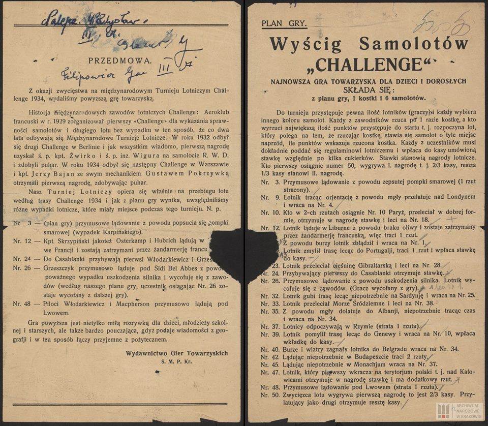 Grę stworzono niejako dla uczczenia dwóch kolejnych, słynnych do dziś, zwycięstw naszych lotników na Międzynarodowych Zawodach Samolotów Turystycznych "Challenge" - w 1932 i 1934 r. Grę wydaną przez Salon Malarzy Polskich stworzył sławny malarz, pisarz i wojskowy - Józef Czapski.