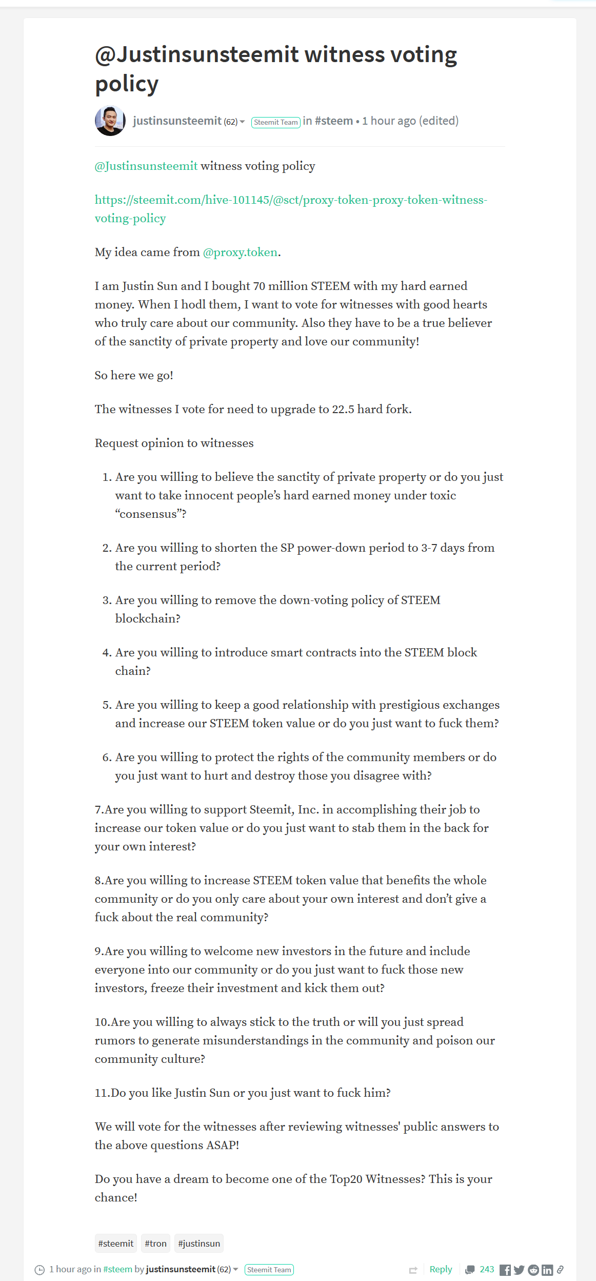 Koreańczycy zdają się zdawać sobie sprawę, z tego jak wygląda sytuacja, jednak dają Panu Chińczykowi możliwość wypowiedzenia się i przedstawienia swojej oferty. Koreańska społeczność nie tylko poróżniła się z resztą w sprawie SF 22.2, ale również wydaje się wyczerpana krypto-zimą i chce zmian na platformie, zwracają uwagę na to, że wiele inwestrów i użytkowników odeszło, jak bardzo cena STEEMA spadła i na naglącą potrzebę zmian i nowych inwestorów. Sun wciąż wydaje się dla nich nadzieją na lepsze, pytany jednak o konkretne rozwiązania motał się i najlepsze co miał do zaoferowania to głosy w stylu "coś wymyślimy". Tak, czy inaczej, jedna z przetłumaczonych z koreańskiego wiadomości mówi, że chcą utrzymać obecny balans witnessów jeszcze przez 2-3dni (zależy od kiedy liczyć).