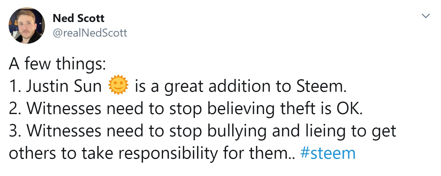 Do akcji wkroczył również Ned Scott, który najpierw na Twitterze zapewniał, że Sun chce dobrze, a następnie, podczas jednej z konferencji z witnessami ogłosił, że nie było żadnej umowy dotyczącej użycia ninja-mined stake'a. Polecił zajrzeć do sekcji 'about' na steemitowej stronie. Cóż, w tej sytuacji też ciężko już mówić o jakimkolwiek zaufaniu... Nasuwa się pytanie, kto i dlaczego kłamie? Czy Justin Sun nie wiedział, co kupuje, a teraz naciska prawnikami na Neda, czy to Ned od początku sprzedał firmę razem z blockchainem?
