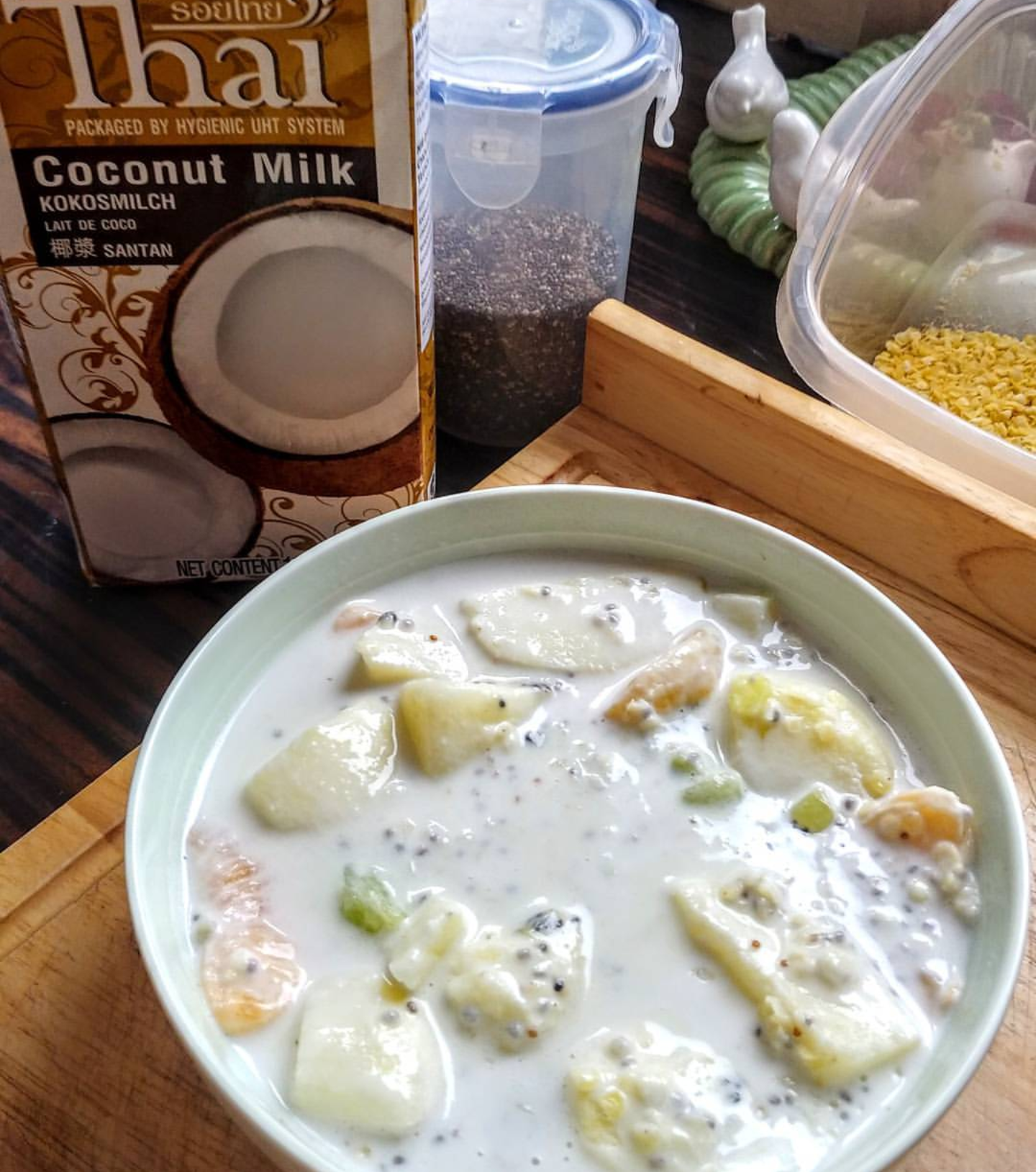 Gdzie ją znajduje ? ,wszędzie, każdego dnia . Poranek jest cudowny do tego by wykreować pozytywną energie na cały dzień . Pierwszy posiłek, tak to nazywam . Dziś jaglanka z przepysznymi jabłkami ,o tej porze są najlepsze . Idealne moje ulubione to Ligol – mięsiste ,bardzo aromatyczne ,lekko słodkie po prostu ideał .Kroje je w cząstki lekko dusze ,żeby były na w pół surowe, to klucz miękkiej kruchości ,która jaglance dodaje lekkości i energetycznego rozbudzenia . Do tego lubię dosypać nasiona chia ,suszone jagody acai , to wszystko na przepysznym mleku kokosowym- Thai Cocount Milk ,kupuje je zawsze w Selgrosie. To mleko w smaku przypomina Rafaello ,to obłędna słodycz kokosa ,uwielbiam ,spróbujcie sobie tego mleka a przepadniecie. Czasami na koniec dla efektu energia ,dodaje cytrusa np. jak mam dodaje cząstki pomarańczy albo mandarynki .