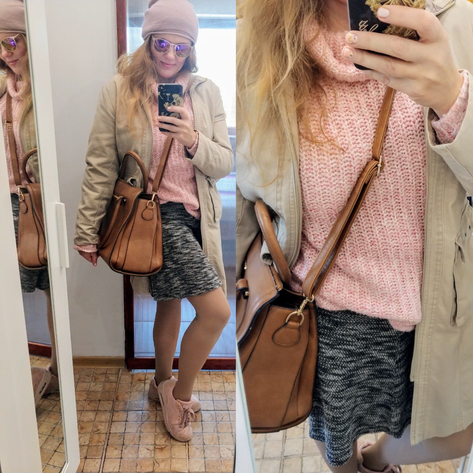Sweterek golfowy kupiłam w sklepie Kik (http://centrumlopuszanska22.pl/butik/kik/ ). Kupiłam go na wyprzedażach w zeszłym roku, kiedy sezon zimowy się kończył, uwielbiam go, do tego spódniczka z New Yorker i moje ukochane sportowe brudno różowe buciki z Renee. Torba w kolorze karmelu , duża pakowna - kupiona w jakiejś sieciówce z 3 lata temu. Płaszczyk na podszewce płócienny, z House (ma z 8 lat) , różowa czapka i ruszam.