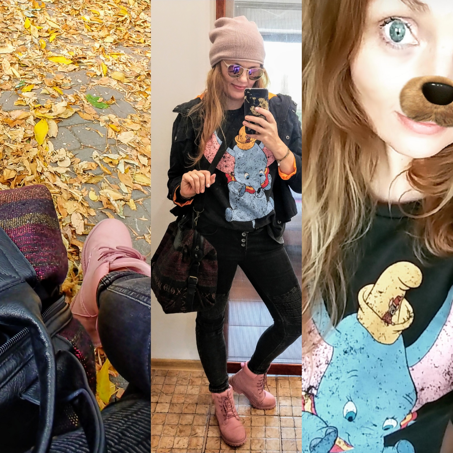 Dumbo to koszulka z ZARY, do tego czarne dżinsy z New Yorker ( 3 sezon zaczynają ze mną ) , kurtka 3/4 czarna z New Looka (3-4 sezon ze mną jest rewelacyjna sprawdza się na wiele looków ). Cudowne różowe trapery (zaczynamy 2 sezon razem) kupione w sklepie internetowym Renee https://www.renee.pl . Torebka 👜 ma z 8 lat, albo więcej, unikat bazarowy 🙃, do tego różowa czapka i ruszamy 🤩
