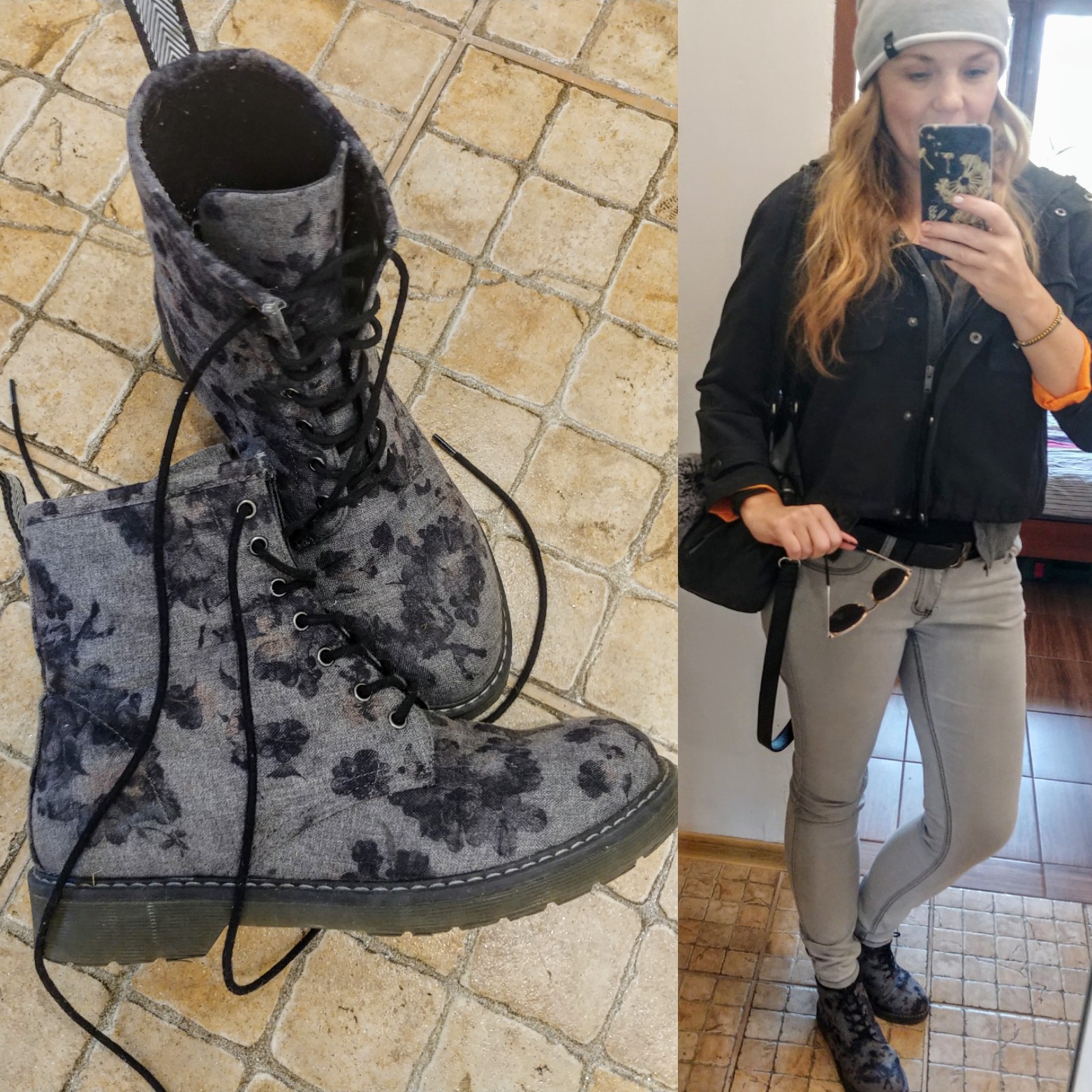 Szare spodnie dżinsowe z New Yorker (3 sezon ze mną ), czarna bluzeczka - zwykły top, szary sweterek w serek z C&A, do tego jedne z moich ulubionych butów - szare trapery w motywy kwiatowe ( 3 sezon ze mną kupione w New Yorker ), kurteczka New Look , czapka Sinsay.