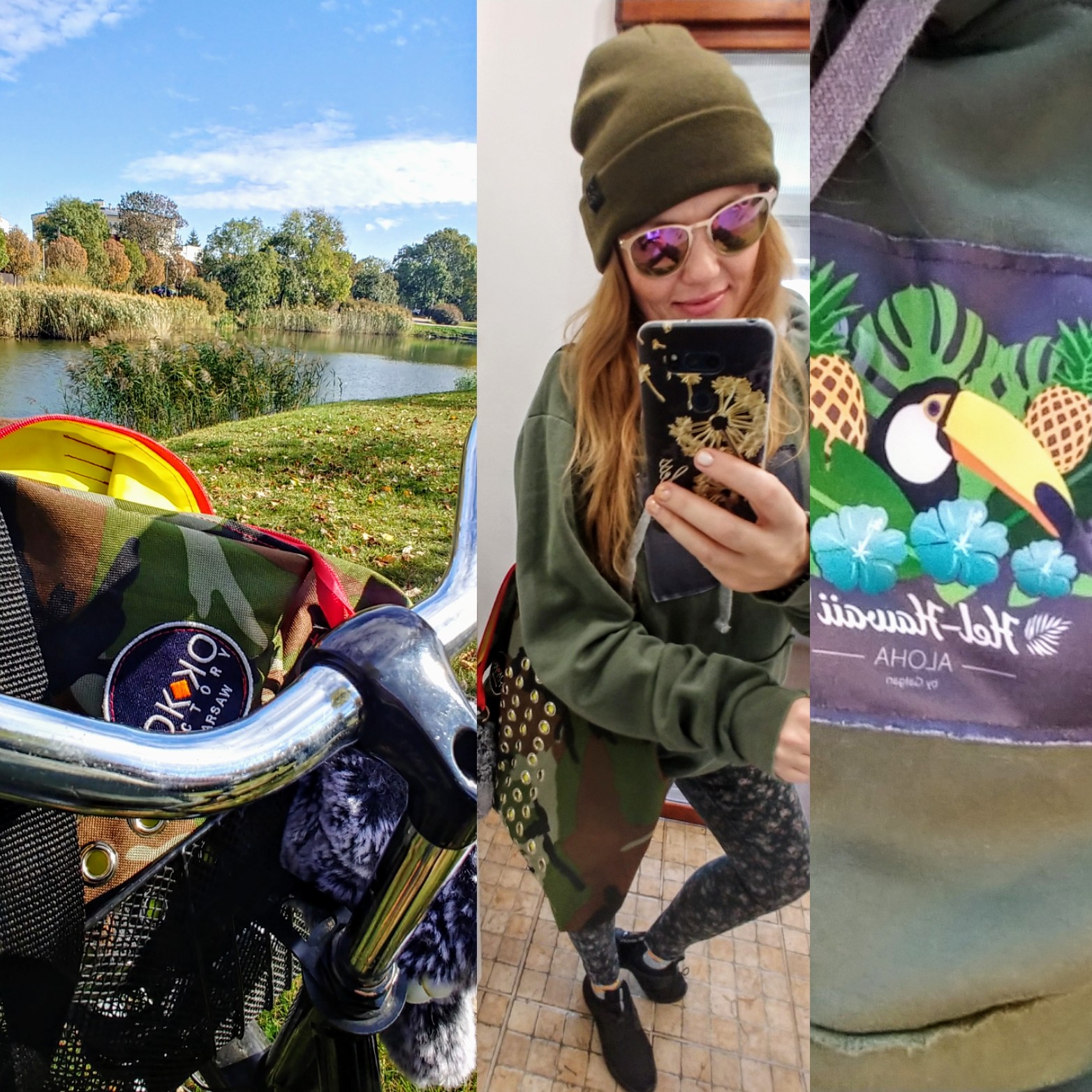 Bluza Gałgan (https://gałgan.pl/ubrania/198-tukan-na-helu.html ) uwielbiam ją, jest drugi sezon ze mną. Stylizuje ją na różne sposoby, do spódniczki i do spodni, teraz świetnie sprawdza się na rowerze. Spodnie to bardzo stare dżinsy, sprane ,ale świetnie się sprawdzają , ledwo widoczny print w ciemne różyczki ( C&A) , do tego czarne sportowe buty. Torba moro wielka, z ćwiekami na kształt Pałacu Kultury, dużo pomieści, jest wodoodporna . Wyjątkowa dawno ją kupiłam , zamawiałam przez internet, nie wiem, czy firma jeszcze istnieje, ale na zdjęciu widzicie logo tej firmy. I oczywiście nie zapominam czapki, zatoki chronię cały rok, czapka Sinsay, to ruszam na rower.