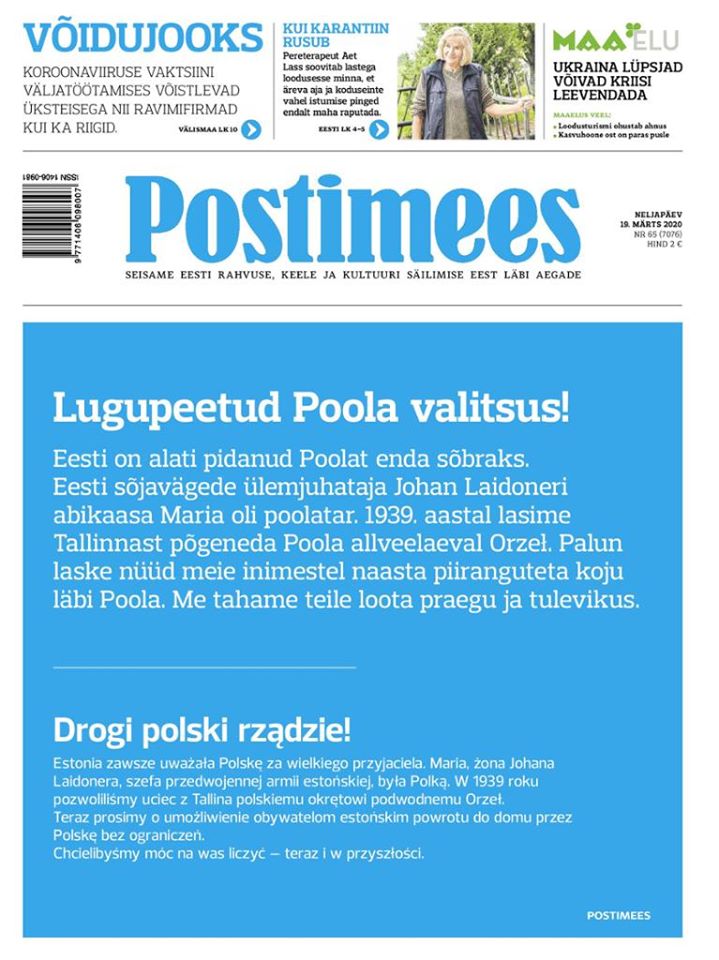Estonia zawsze uważała Polskę za wielkiego przyjaciela. Marla, żona Johana Laidonera, szefa przedwojennej armii estońskiej, była Polką. W 1939 roku pozwoliliśmy uciec z Tallina polskiemu okrętowi podwodnemu "Orzeł". Teraz prosimy o umożliwienie obywatelom estońskim powrotu do domu przez Polskę bez ograniczeń. Chcielibyśmy móc na was liczyć - teraz i w przyszłości.