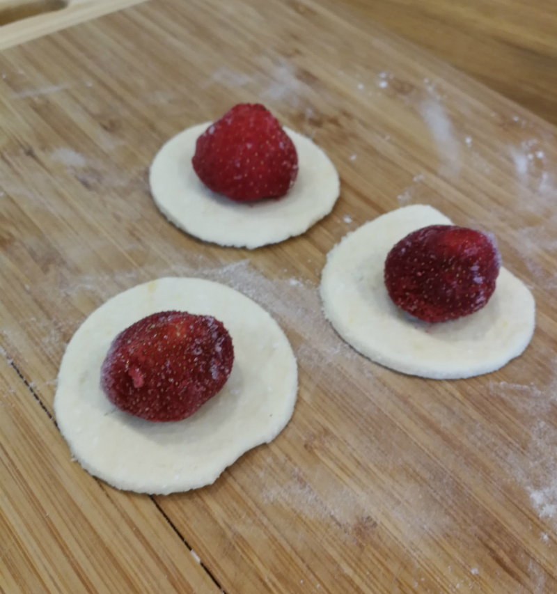- Rozwałkowujemy ciasto i dzielimy je za pomocą szklanki/foremki na mniejsze części. Do każdego płatka ciasta wkładamy truskawkę, a następnie zawijamy ciasto w kulkę.
