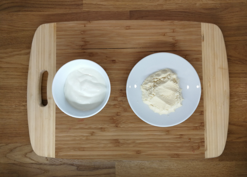 Przygotowanie polewy białkowej ogranicza się do zmieszania w miseczce 100g jogurtu i odżywki białkowej :)