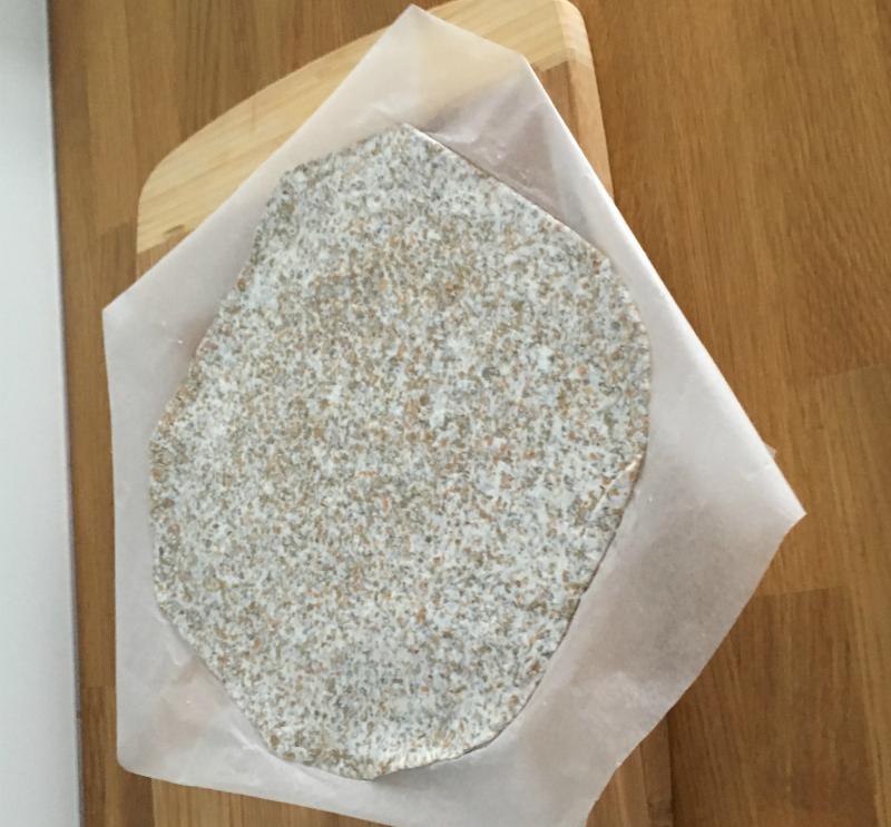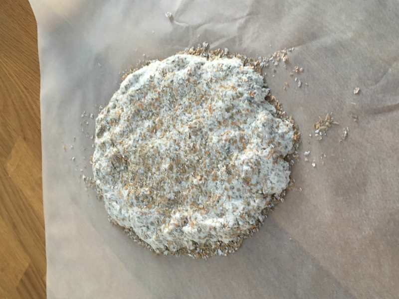 - Z wyrobionej masy rozwałkuj ciasto. (Z racji na specyficzne składniki jakich używam polecam ci rozwałkowywać ciasto na papierze do pieczenia posypanym otrębami, zapobiegnie to przyklejaniu się ciasta na dalszym etapie)