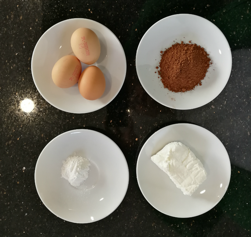 - białka ubijamy, a żółtka mieszamy w misce z twarogiem, proszkiem do pieczenia, kakaem i słodzikiem